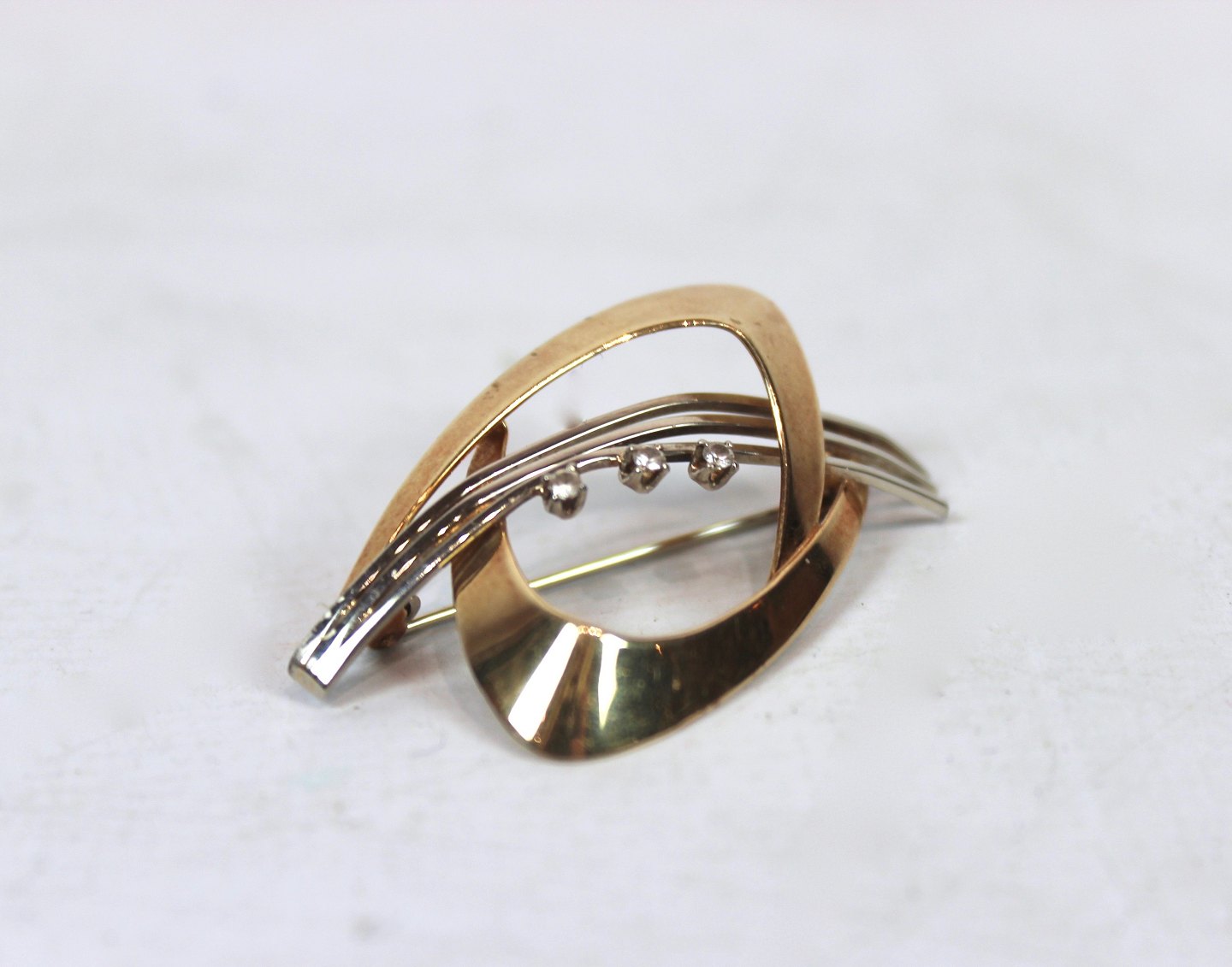 Brooch of 14 carat gold decorated with clear stones and stamped HS. The brooch is in great vintage condition.