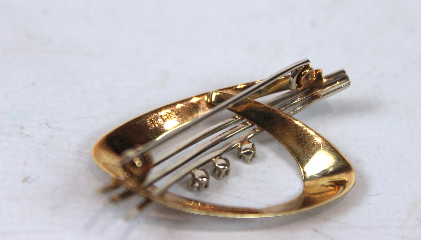 Brooch of 14 carat gold decorated with clear stones and stamped HS.