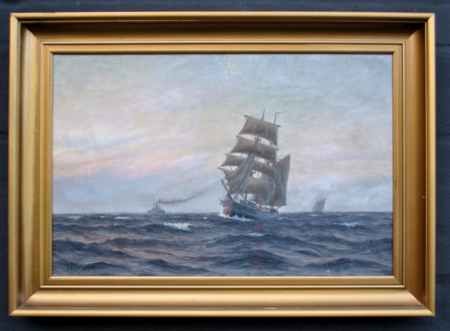 Bülow, A. (19./20. årh) Danmark: Marine. Aften i Sundet. Olie på lærred. Signeret. 32 x 49 cm.