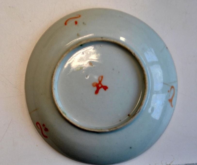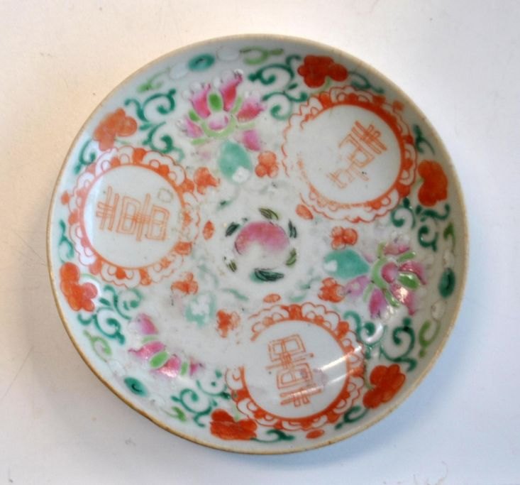 Kinesisk famille rose tallerken, 19. årh. Dekoreret med tegn og blomster. Stemplet. Dia.: 13,5 cm.