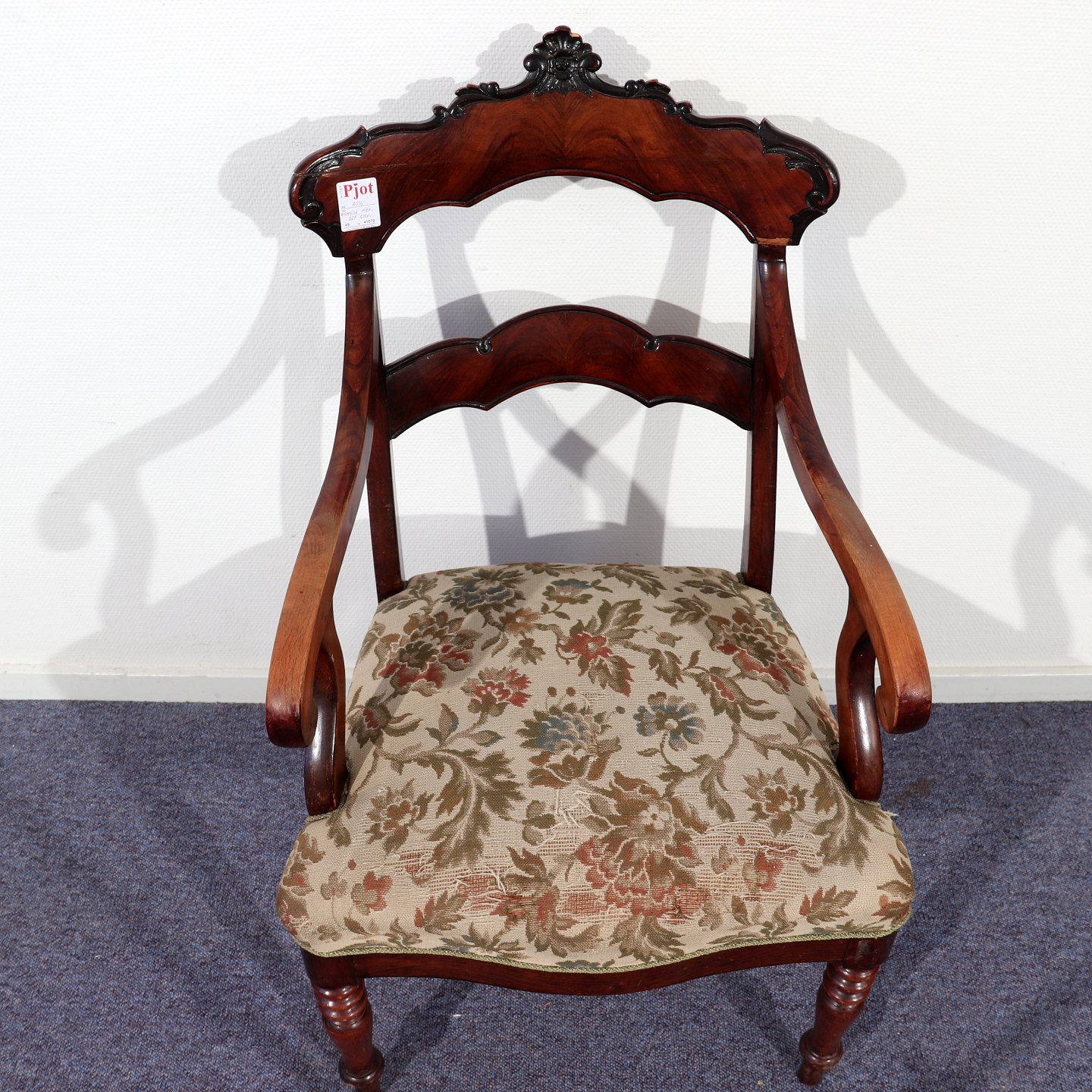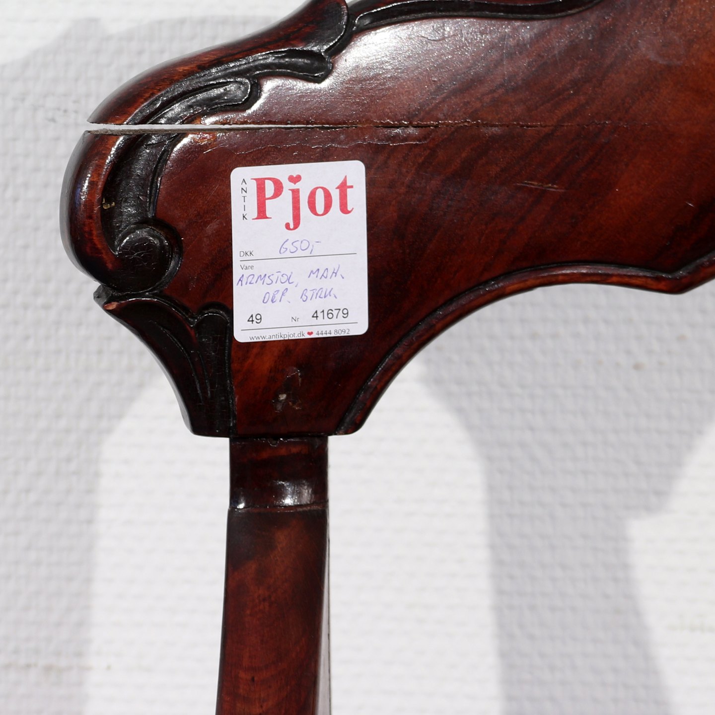 Armstol i fineret mahogni, OBS div. defekter,