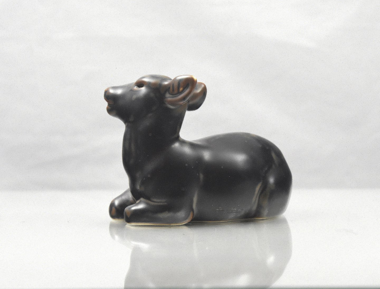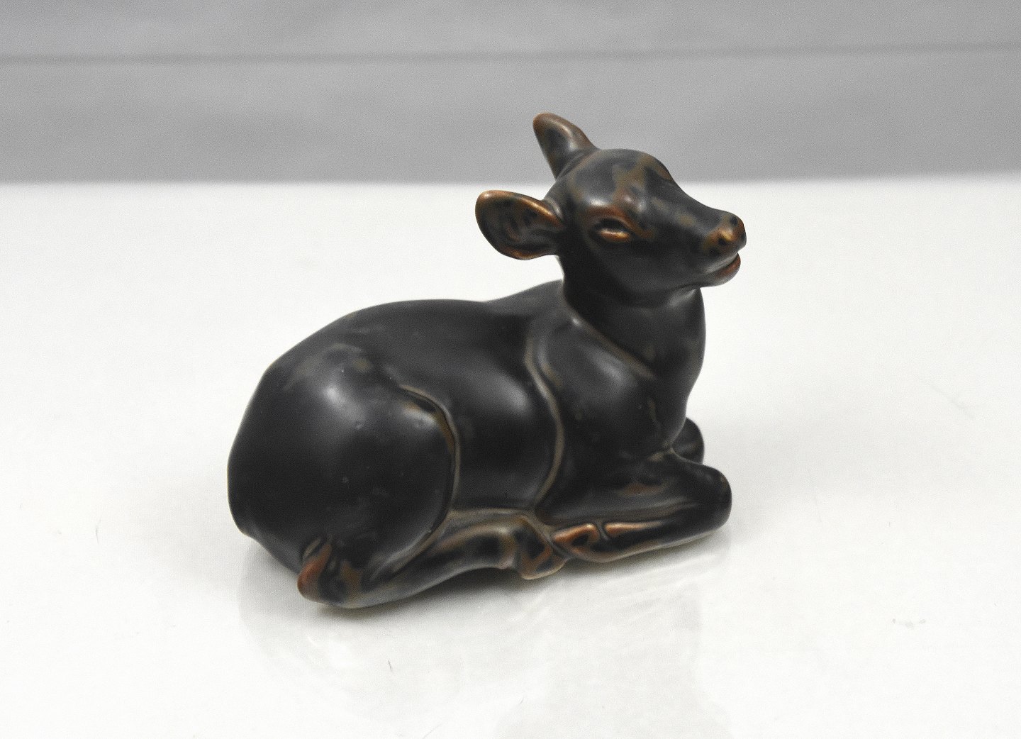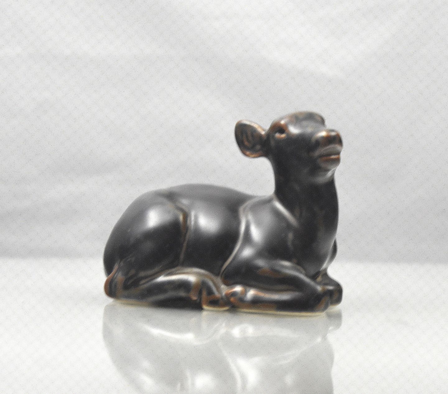 Royal Copenhagen figur af brun, liggende dåhjort, i stentøj, nr 20183.