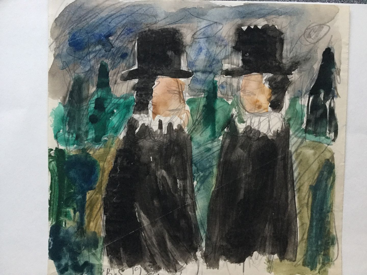 Akvarel af Peder Brøndum Sørensen 1955 - 2 præster i samtale.