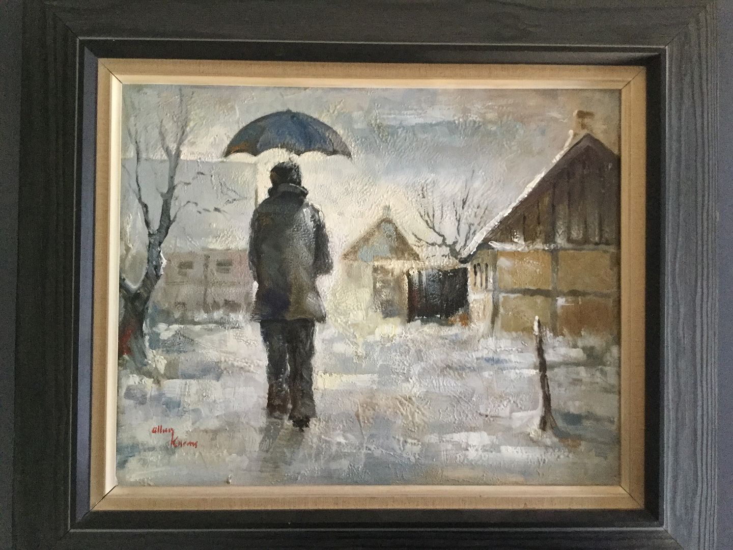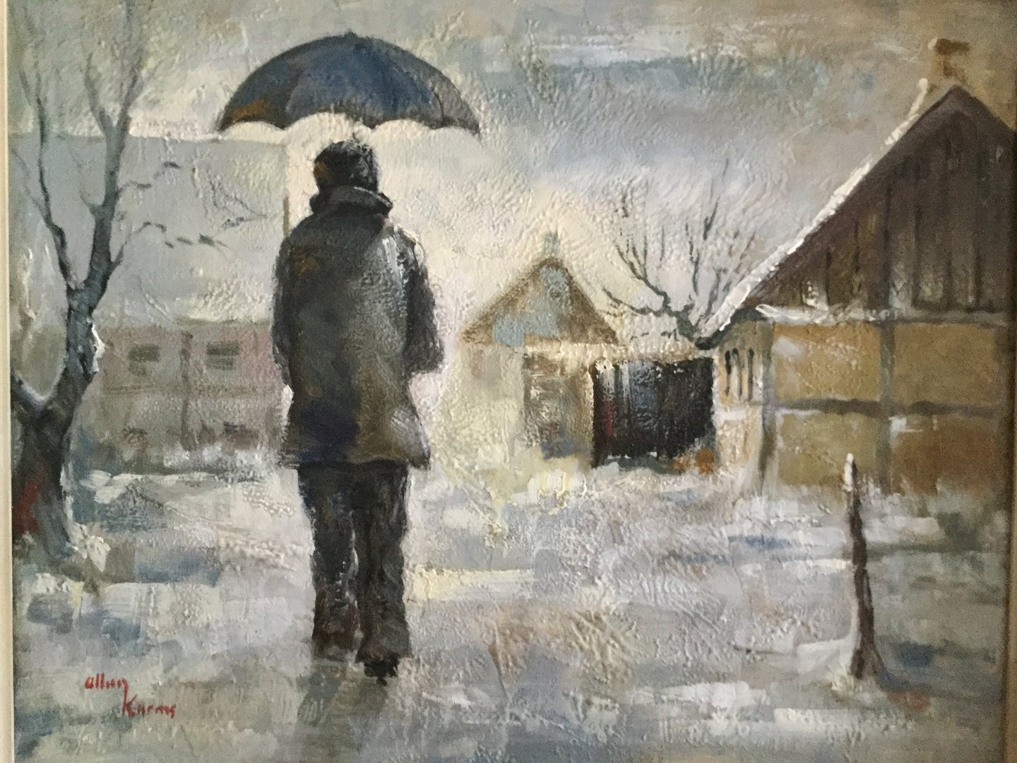 Maleri af Allan Karms - Mand med paraply på vej.