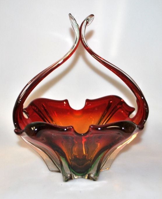 Stor bordskål i rødt glas, 1960'erne. Med hank. H.: 25,5 cm. B.: 22 cm.