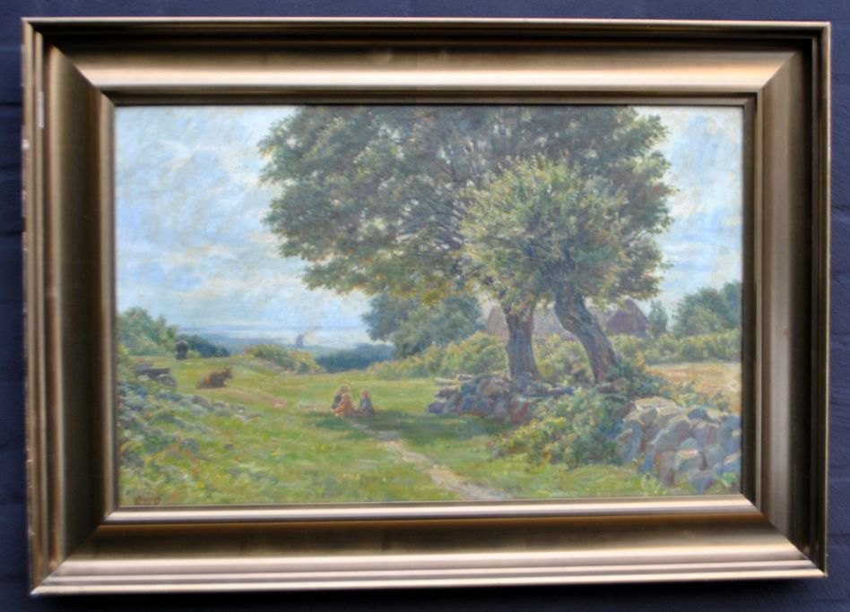 Rud-Petersen, Rudolf Siegfried (1871 - 1961) Danmark. Tre legende børn under et træ. Olie på plade. Signeret: Rud-P 1913. Olie på plade. 42 x 64 cm.
