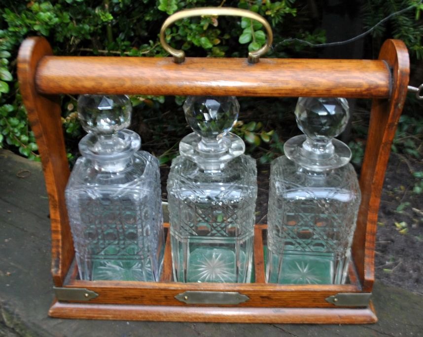 Engelsk tantalus med tre karafler, 19. årh. PoleretEgetræ. Med forsølvede beslag og lås med nøgle. H.: 31 cm. L. 34 cm.
