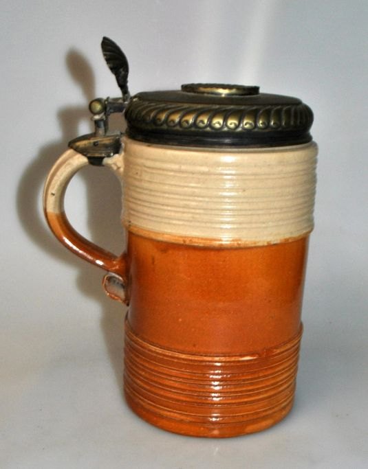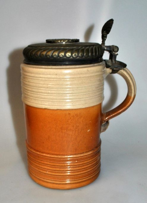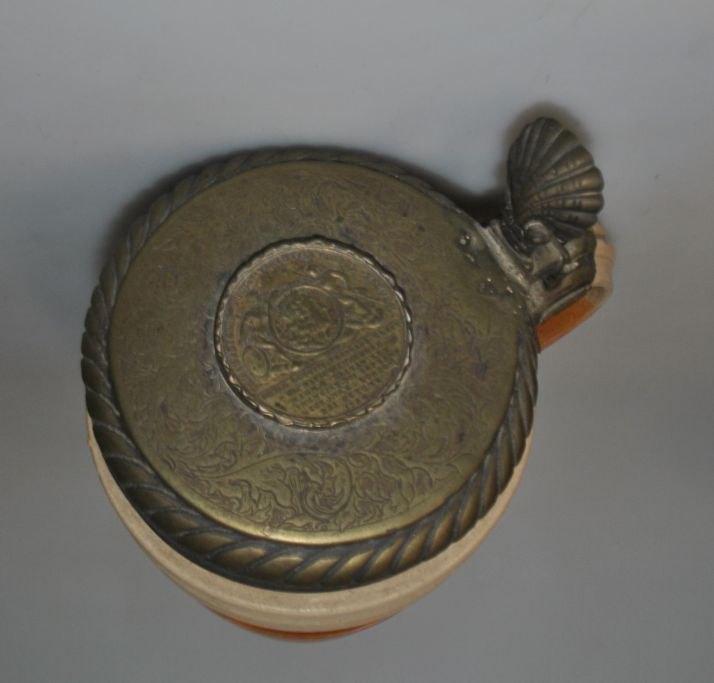 Tysk stentøjs krus, 18. årh. Barok. Lyst stentøj med lysbrunt saltglasur. Med tinlåg med medaljon fra 1774 "Ved dine dyder skal du sejre". Stemplet indvendig. Låg dekoreret med bladværk. H.: 19 cm.