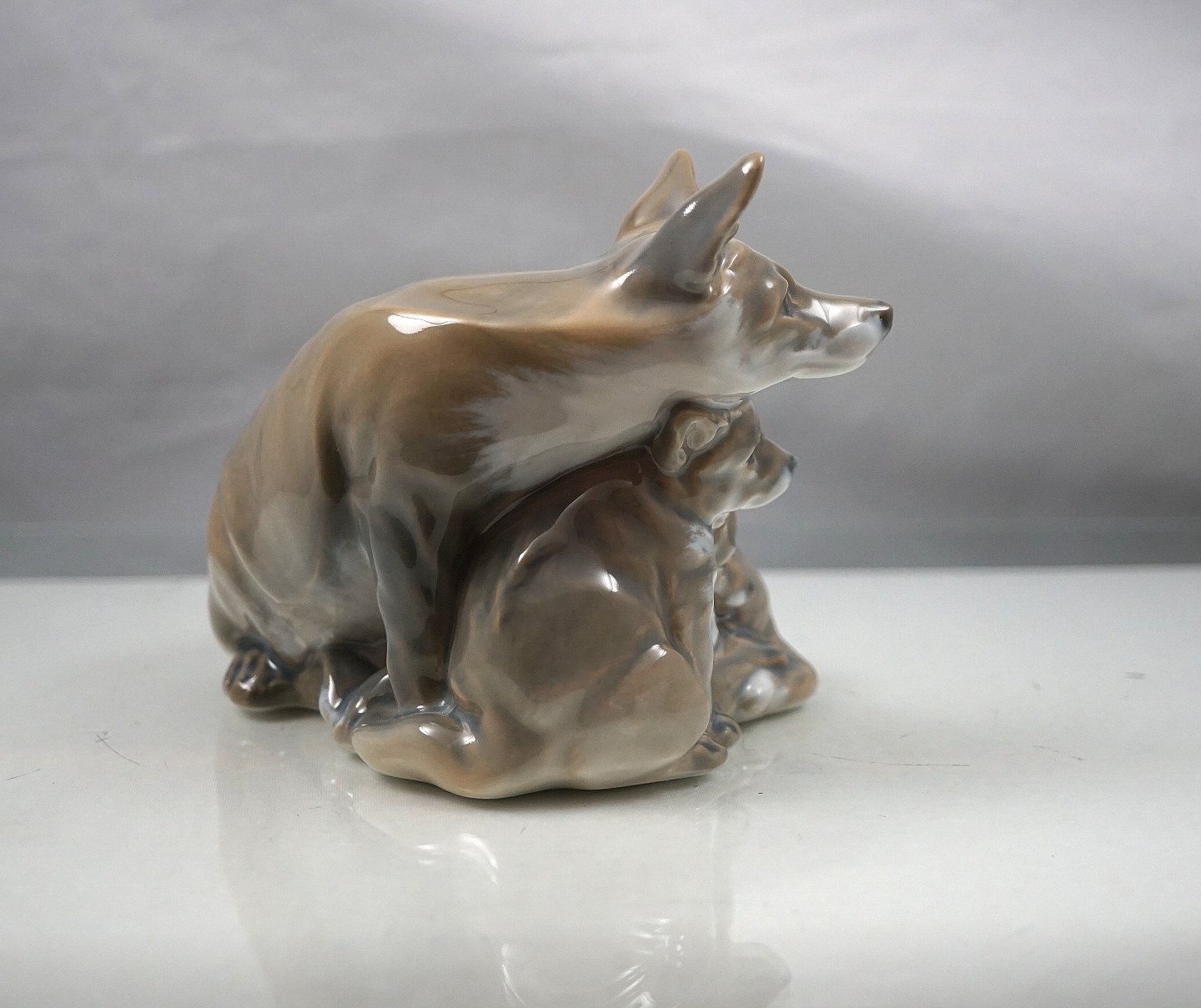 Royal Copenhagen, RC., Den kongelige Porcelænsfabrik, KGL., Kongelig, porcelæn, figur, rævemor, unger, mikkelræv