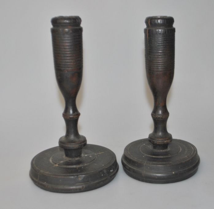 Par danske lysestager af drejet træ, 19. årh. Runde fodstykker. H.: 18 cm.