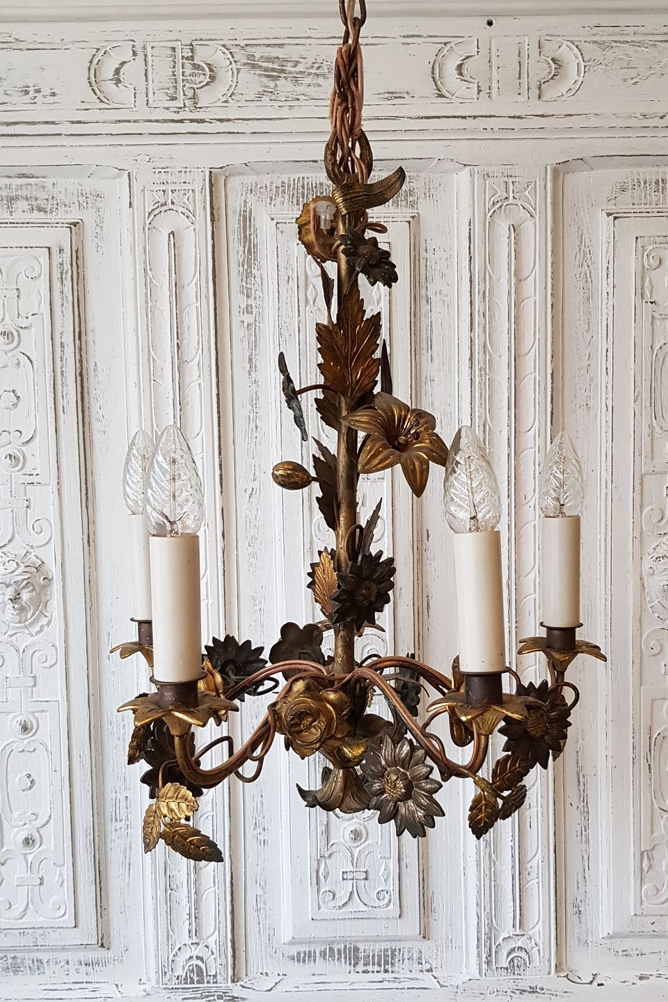 1800tals fransk femarmet lysekrone dekoreret med blomster og blade