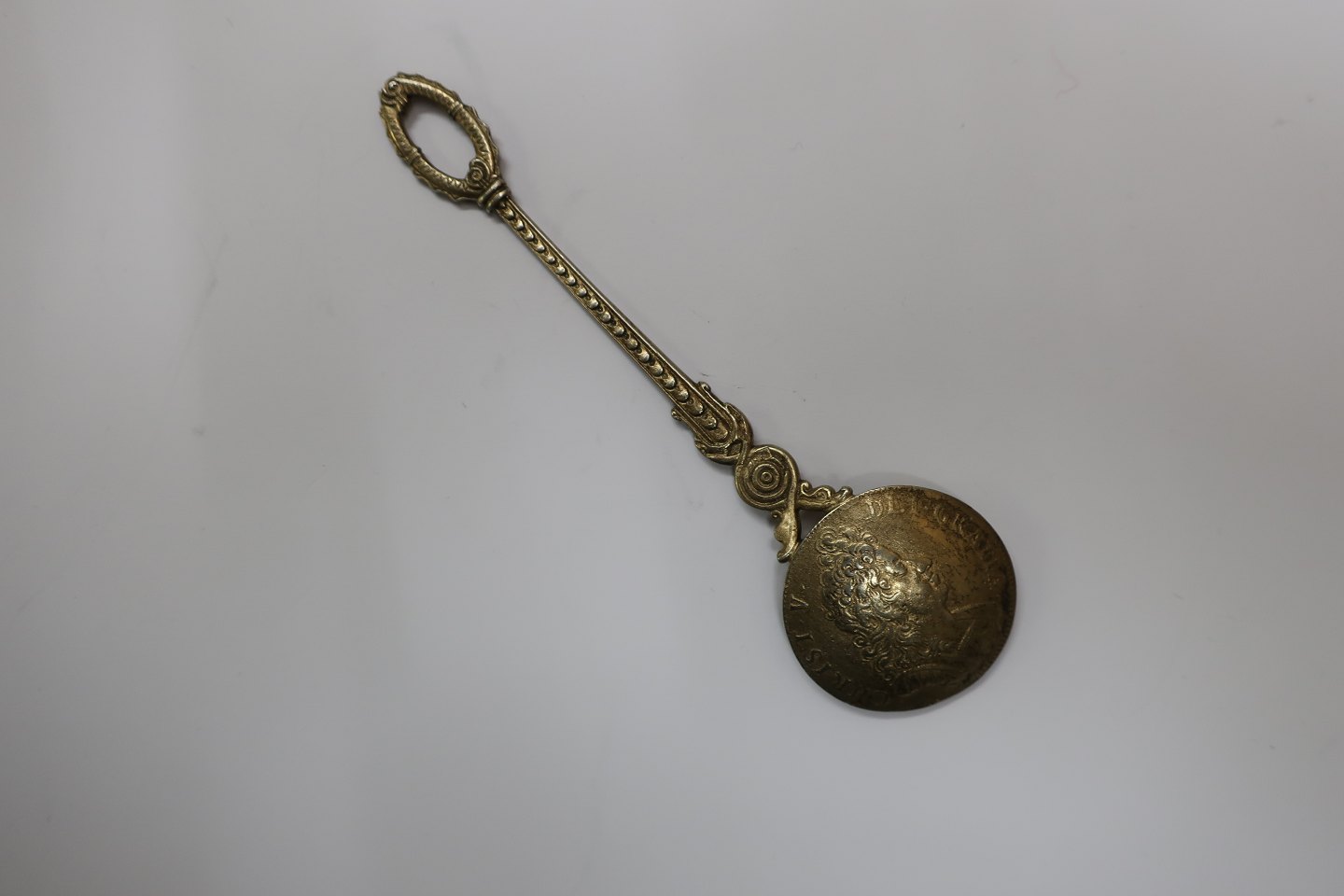 Sukkerske i sølv med mønt. Dansk 1 krone 1693 (Christian V). Længde 12,3 cm