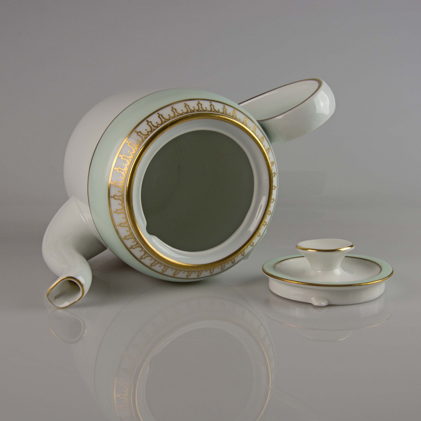 Kande i hvidt porcelæn med lysegrøn kant og gylden dekoration