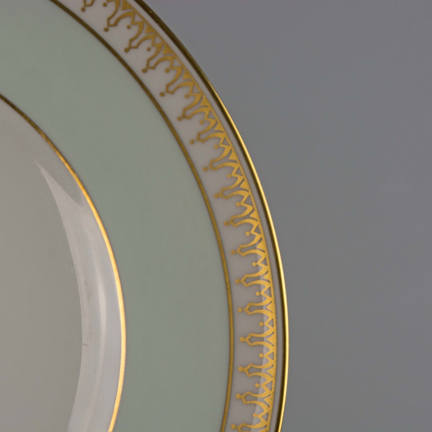 Tallerken i hvidt porcelæn med lysegrøn kant og gylden dekoration
