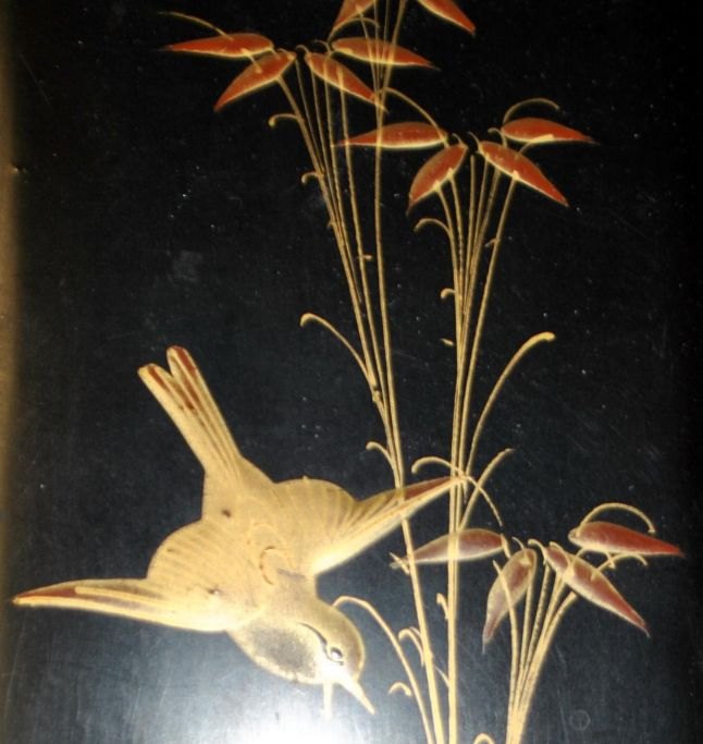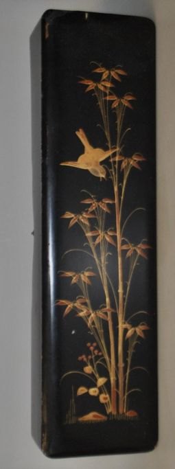 Aflang japansk lak æske med dekorationer, o. 1900. Med låg. Dekorationer i guld med fugl og planter. 36 x 6,5 x 9,5 cm.