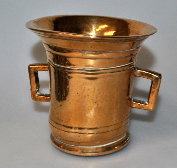 Brass mortar, 19th century Denmark. H.: 12 cm. With pistil: 15 cm. Note: The bottom is curved.