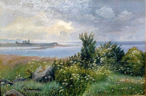 Matthiessen, Hjalmer (1880 - 1957) Danmark: Motiv fra Horsens fjord. Motiv fra Snaptur mod Hjarnø. Hvide skærmplanter. Olie på lærred. Signeret monogram 1909. 49,5 x 74 cm.
