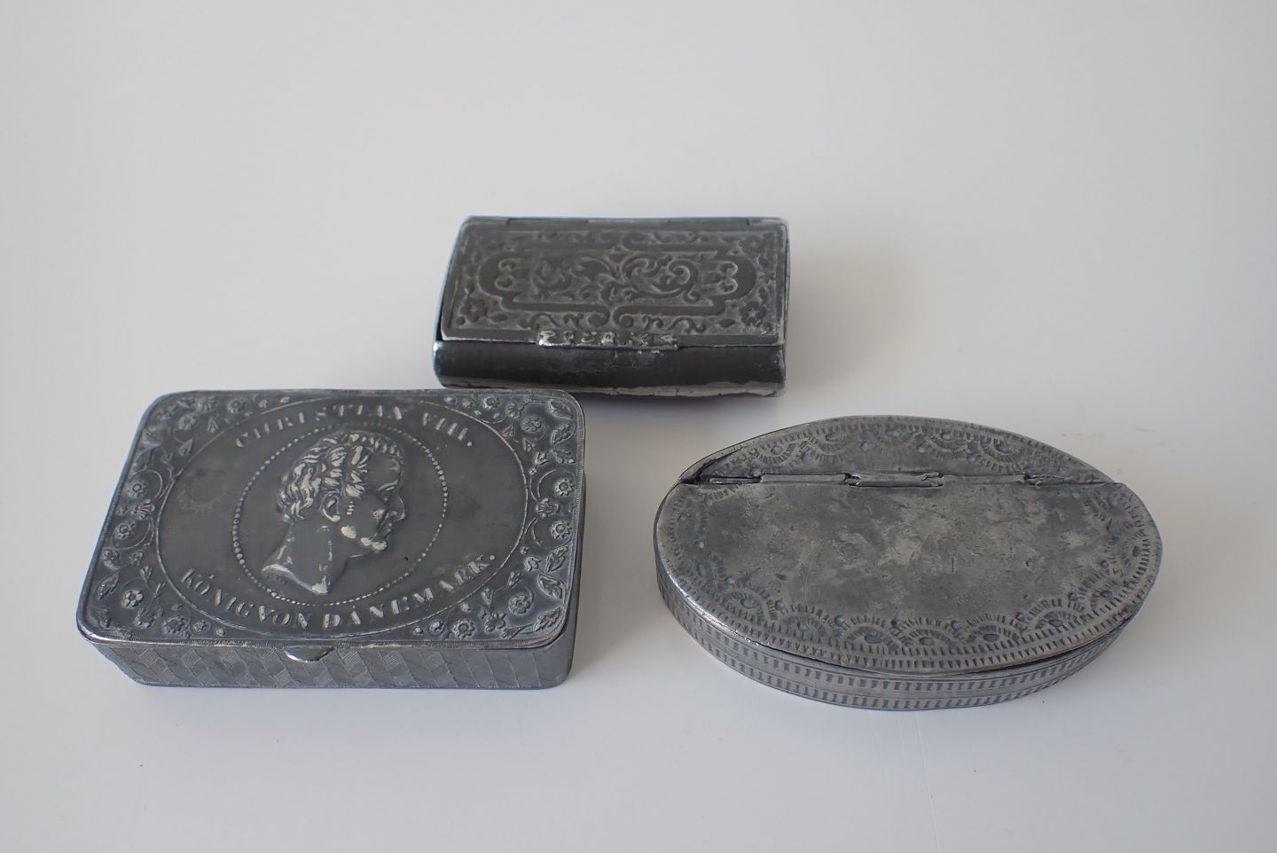 3 snusæsker i tin fra 1800-tallet. Chr. VII æsken er solgt.