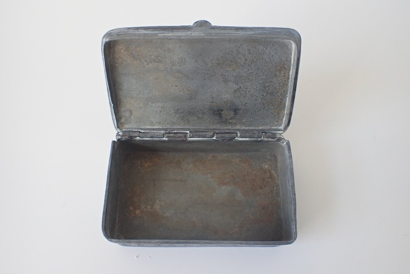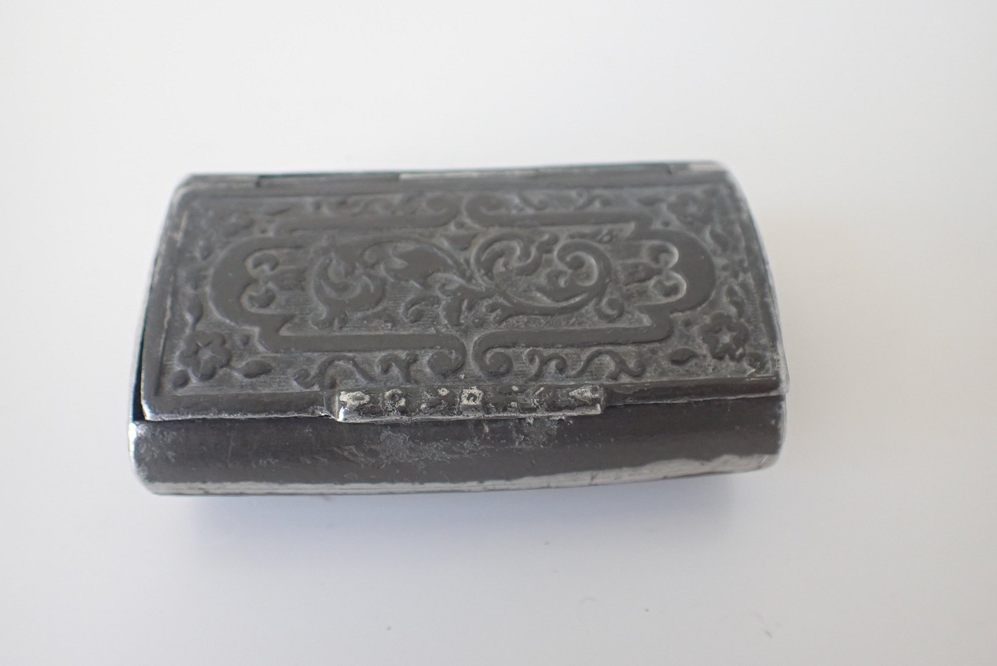 I midten Lille æske i tin med præget dekoration på låg. Dansk? Tidligt 1800- tal. Mål: 5,8 x 3,5 x 1,9 cm. Pris: 300 kr.