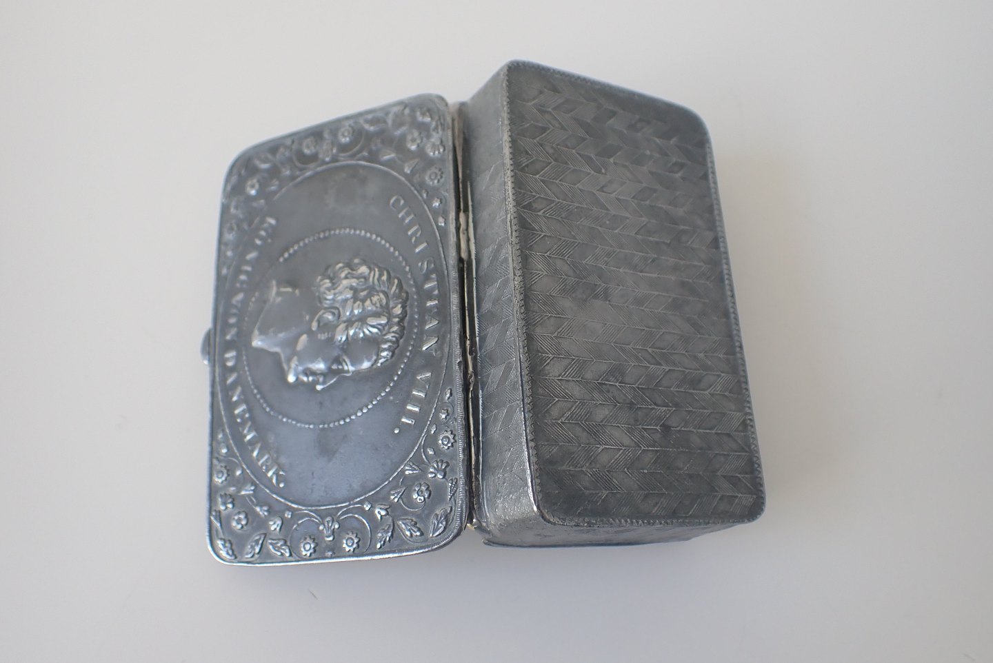 Til vense æske med profil af kong Christian VIII (1786 - 1848 - konge fra 1839 til 1848). Tekst: "Christian VIII. Kònig Von Danemark". Omkredsende blomsterdekoration på låg samt stiliseret vinkeldekoration på sider og bund. 1800 - tallets første halvdel. Mål: 7 x 4 x 1,8 cm. Solgt.