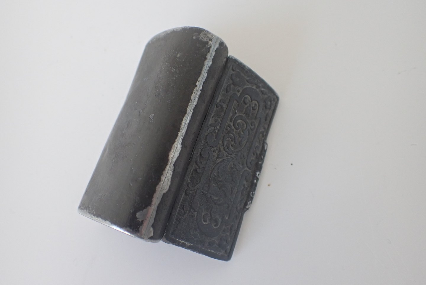 Til højre Oval æske i tin med prægede dekorationer på alle ydre sider. Utraditionelt låghængslet vippelåg. Formentlig engelsk tidligt 1800 - tal. Mål: 7,1 x 4,4 x 1,4 cm. Pris: 400 kr.