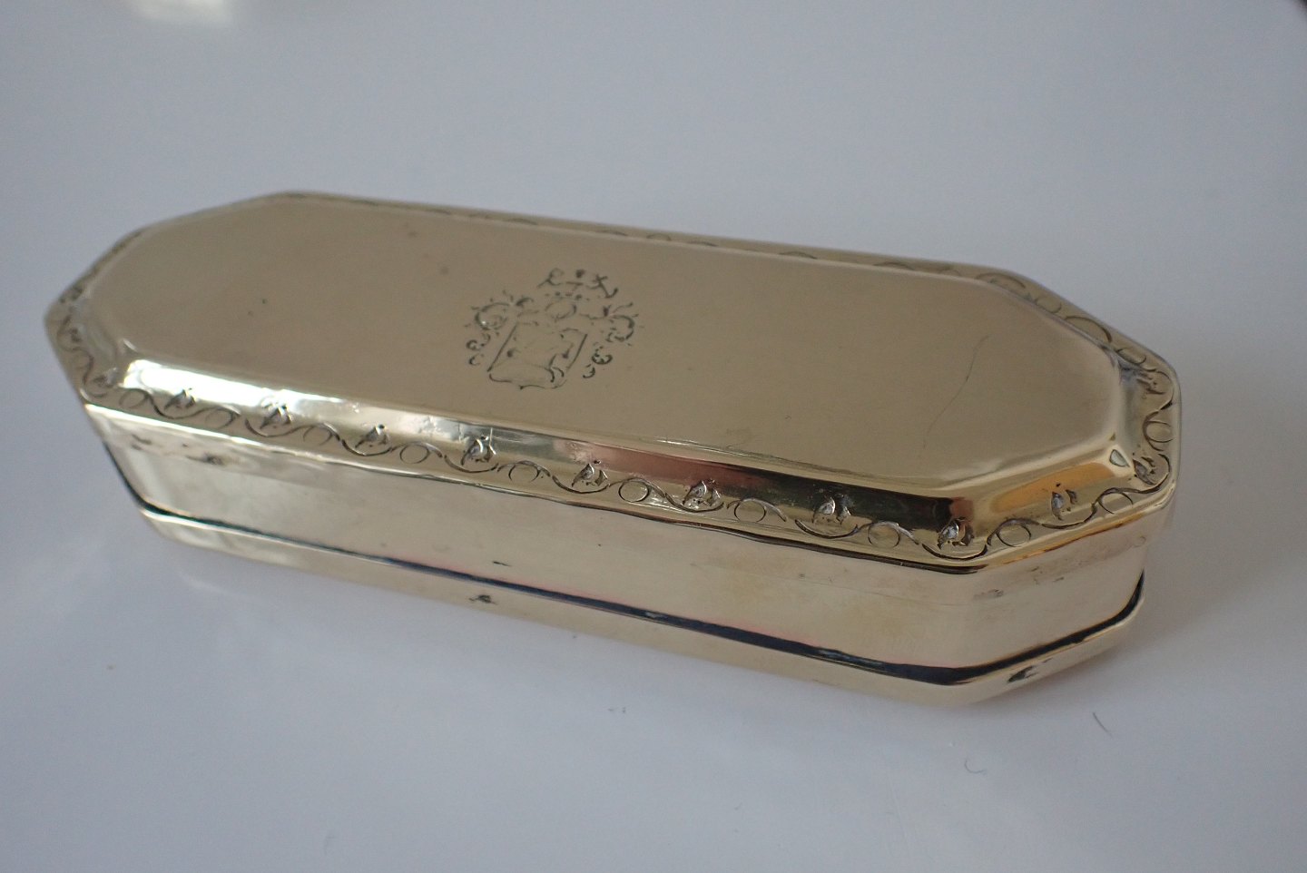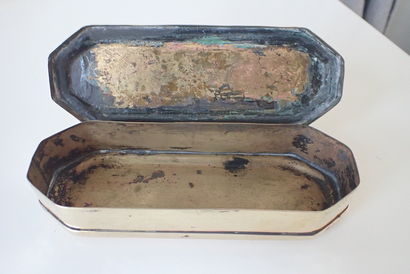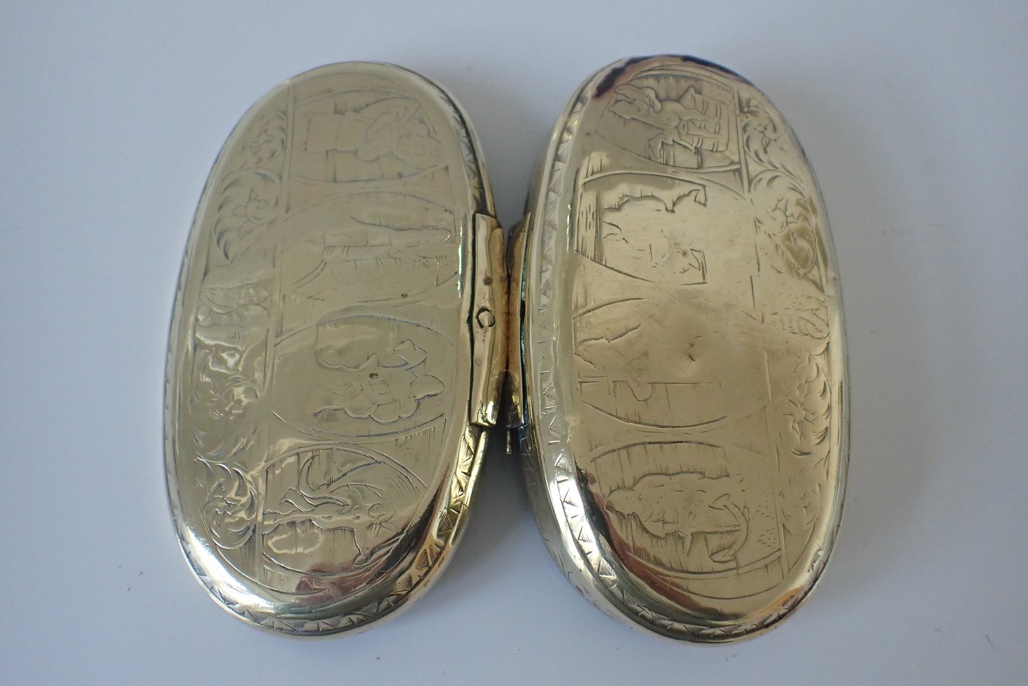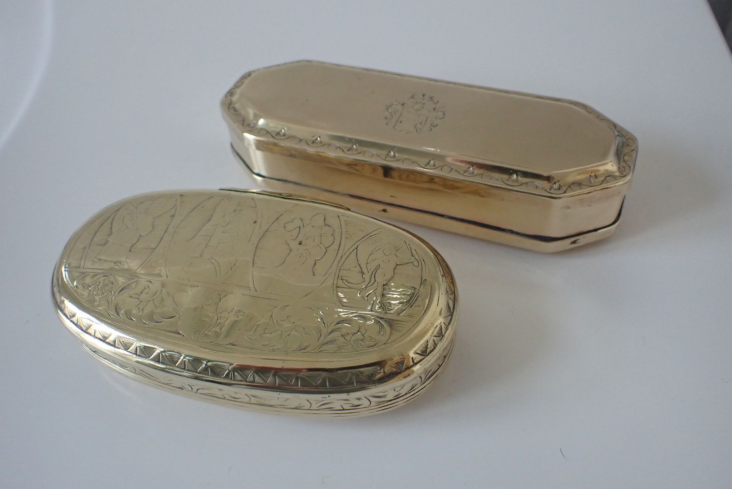 2 tobaksdåser i messing. Den ovale dåse i forgrunden er solgt.