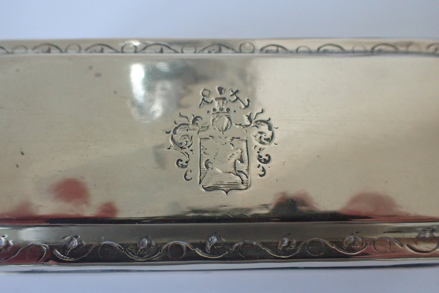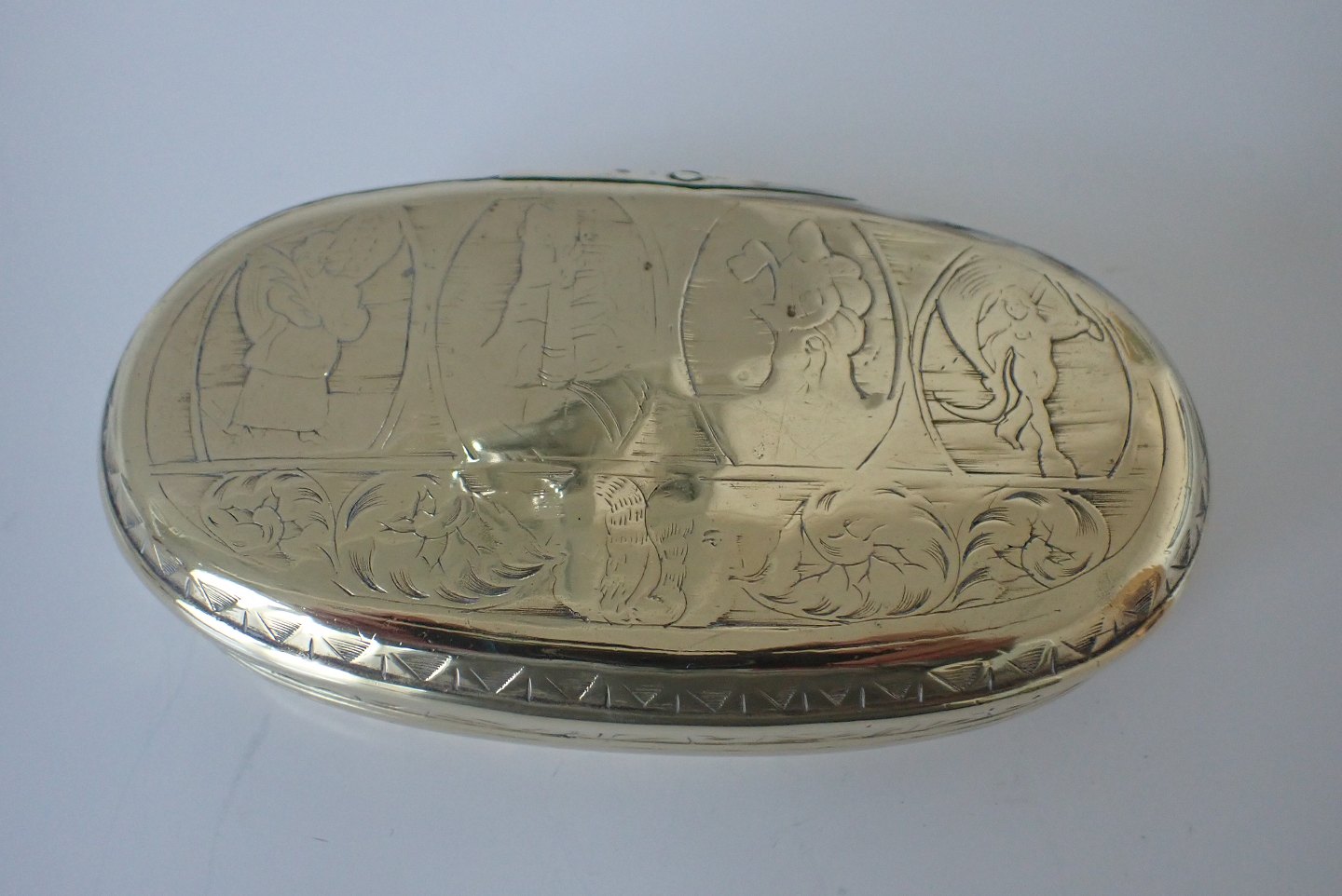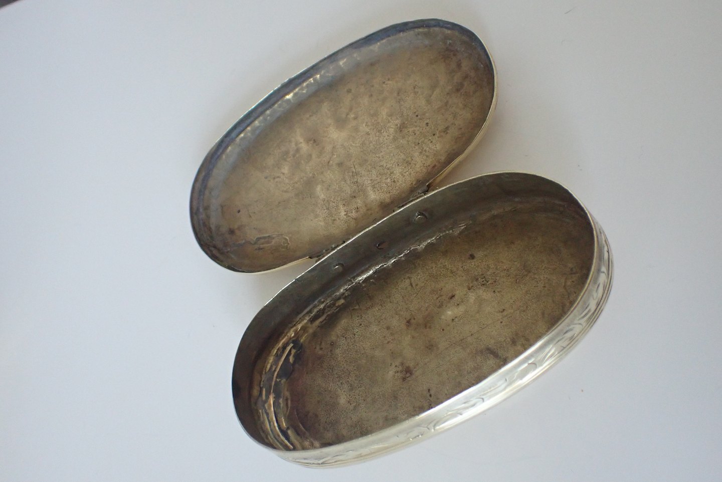 Forrest: Oval hollandsk dåse fra 1700-tallets slutning dekoreret figurer og blomster. Mål: 12,2 x 7 x 2,8 cm. Solgt.