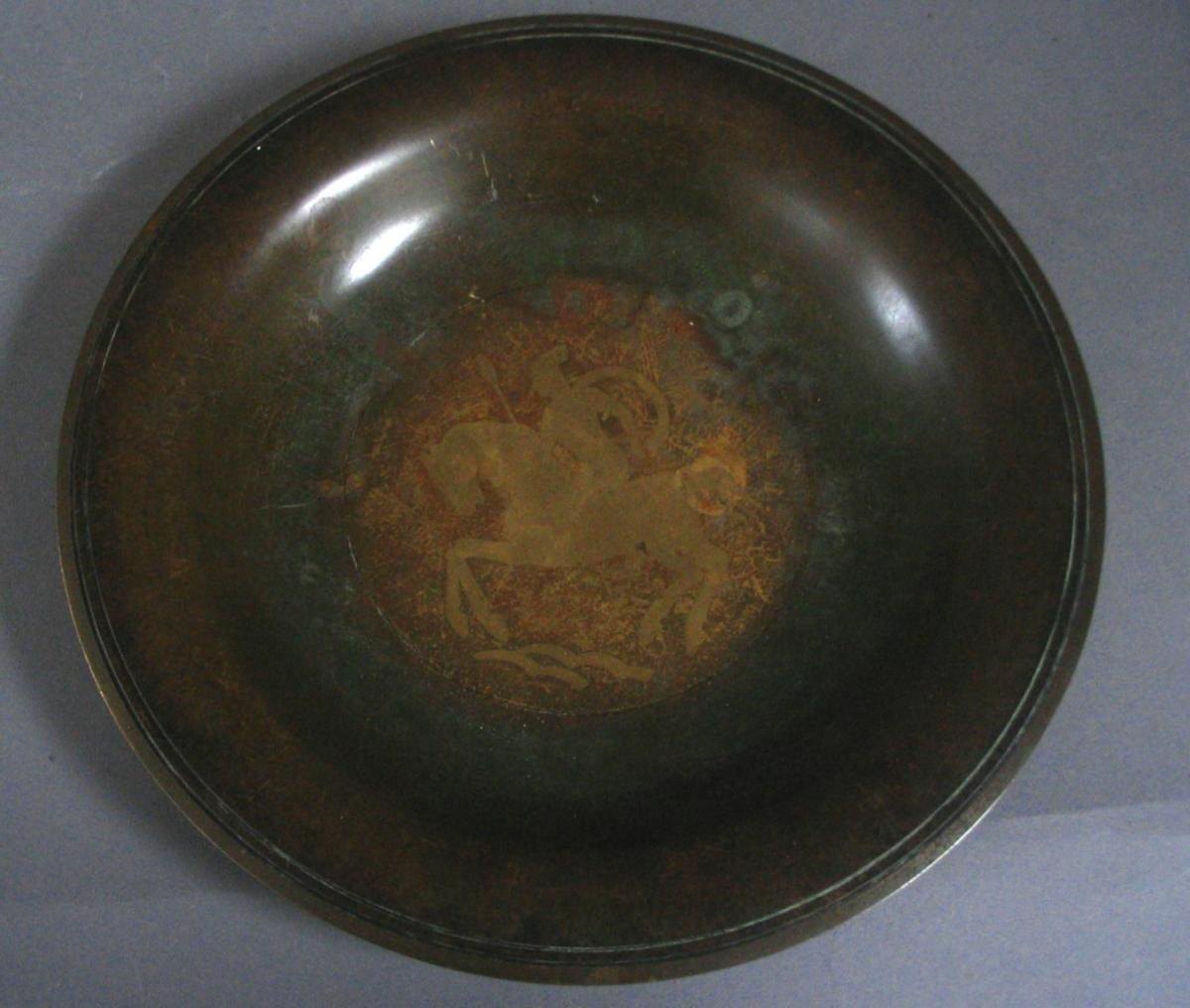 Bronzefad, Danmark, 1930'erne. Danmark. Med motiv af ridder på hest. Delvist patineret. Stemplet med Krone. Ildfast Bronze. Dia.: 27 cm.
