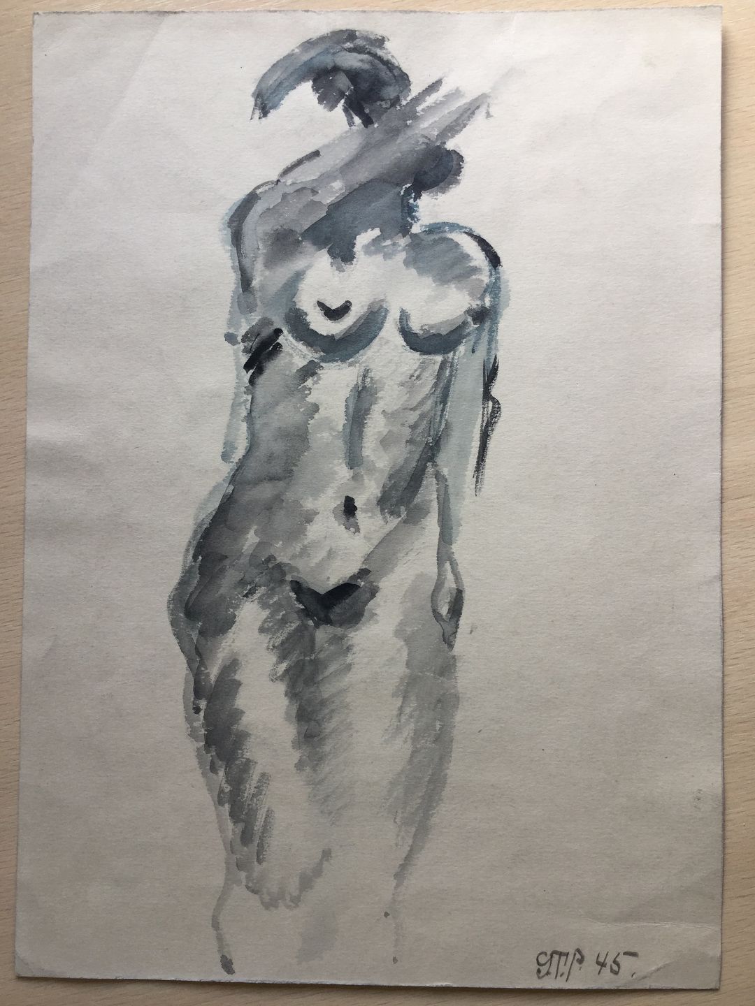 Tegning/akvarel af Georg Tscherning-Petersen 1945 - "Nøgen kvindemodel"