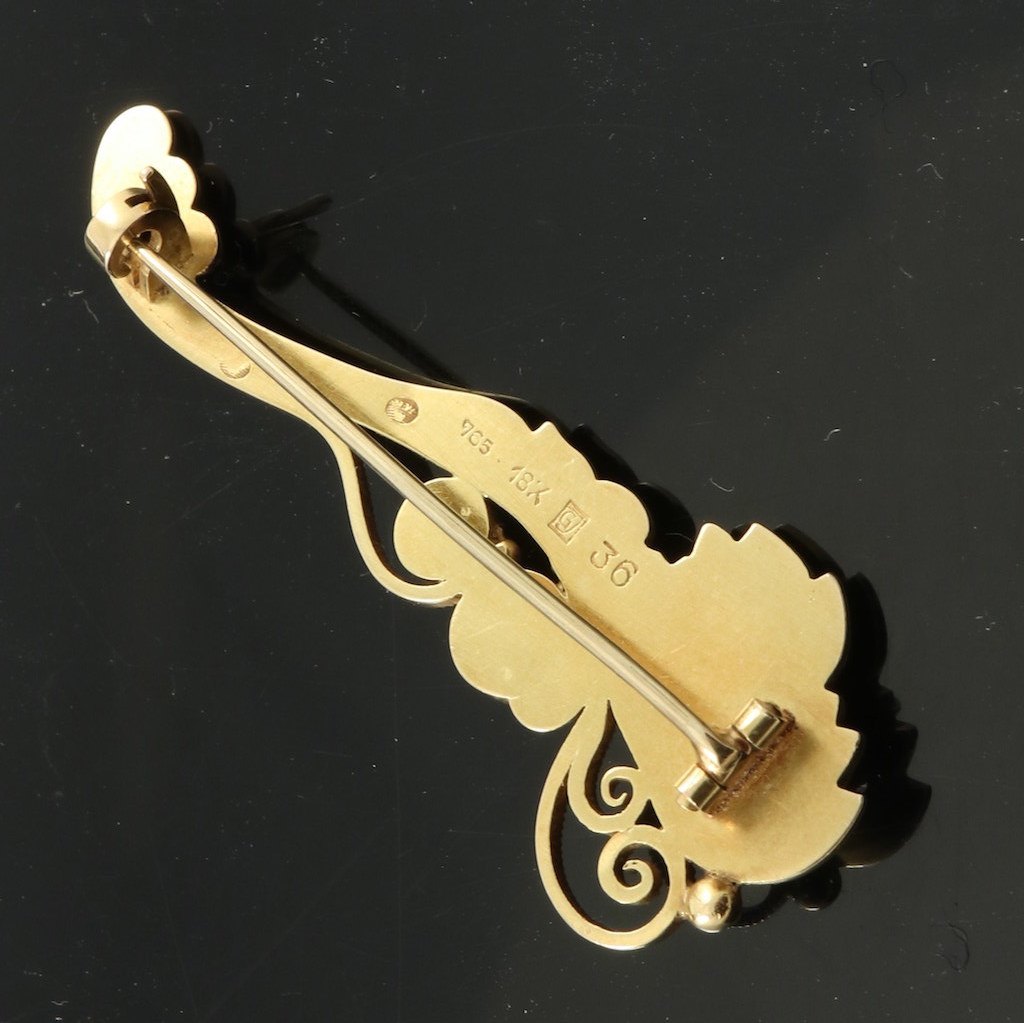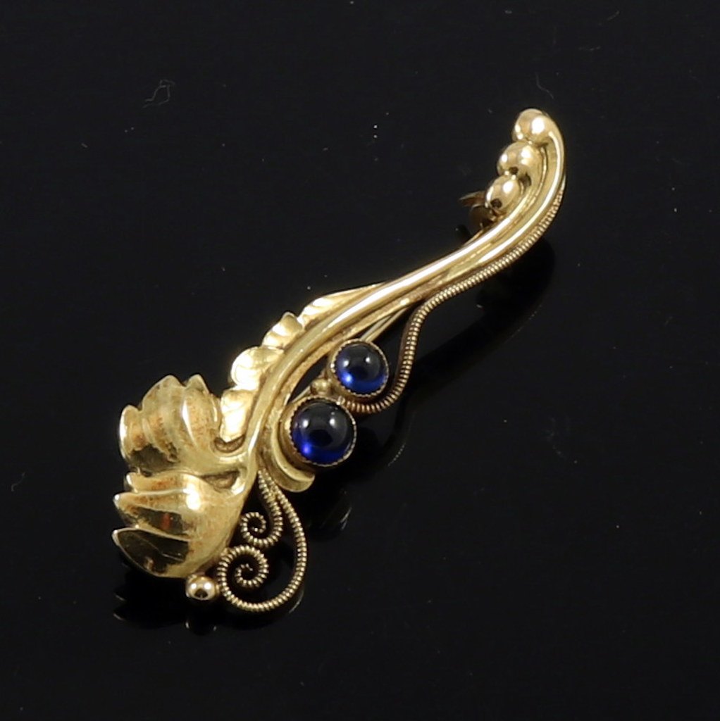 Georg Jensen Broche i 18k guld med syntetiske safirer #36. 1933-1944 stempler.