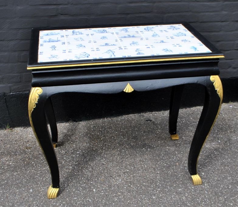 Tile table, approx. 1930, Denmark. Black painted with gilding. With 24 inlaid copies of Dutch tiles.