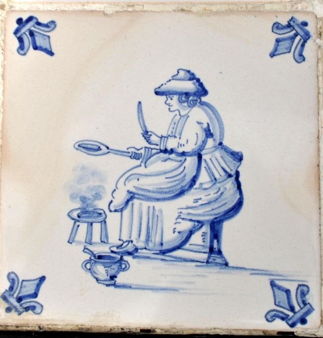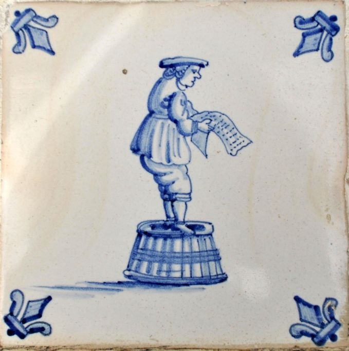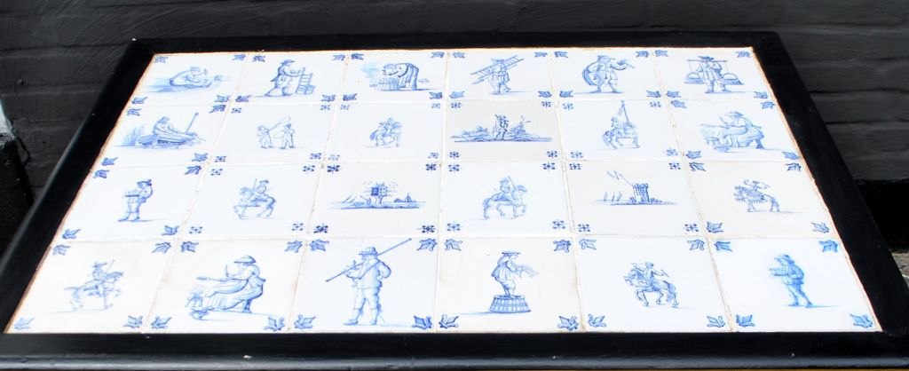 16 older 20th century hand-painted tiles with French lily and motifs by: executioner, beer man, fisherman, scales, doorman, soldier, speaker, cook etc. and 8 tiles in the middle.