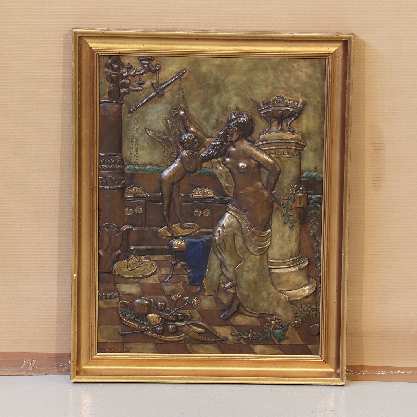 Historisk motiv, farvet metal i forgyldt ramme, (HxB 70x53 cm), signeret