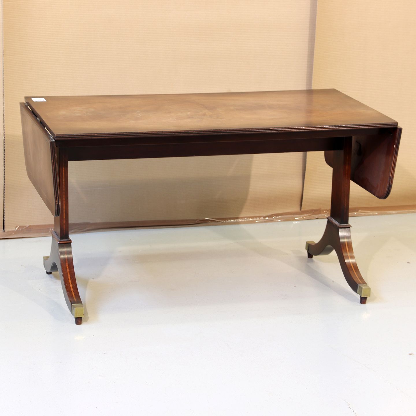 Sofabord i fineret mahogni m. klapper, OBS diverse skjolder på pladen,