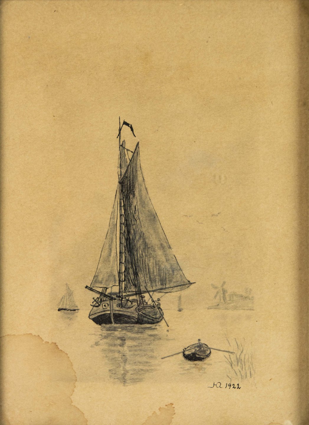 Tegning med motiv af sejlskibe på hav