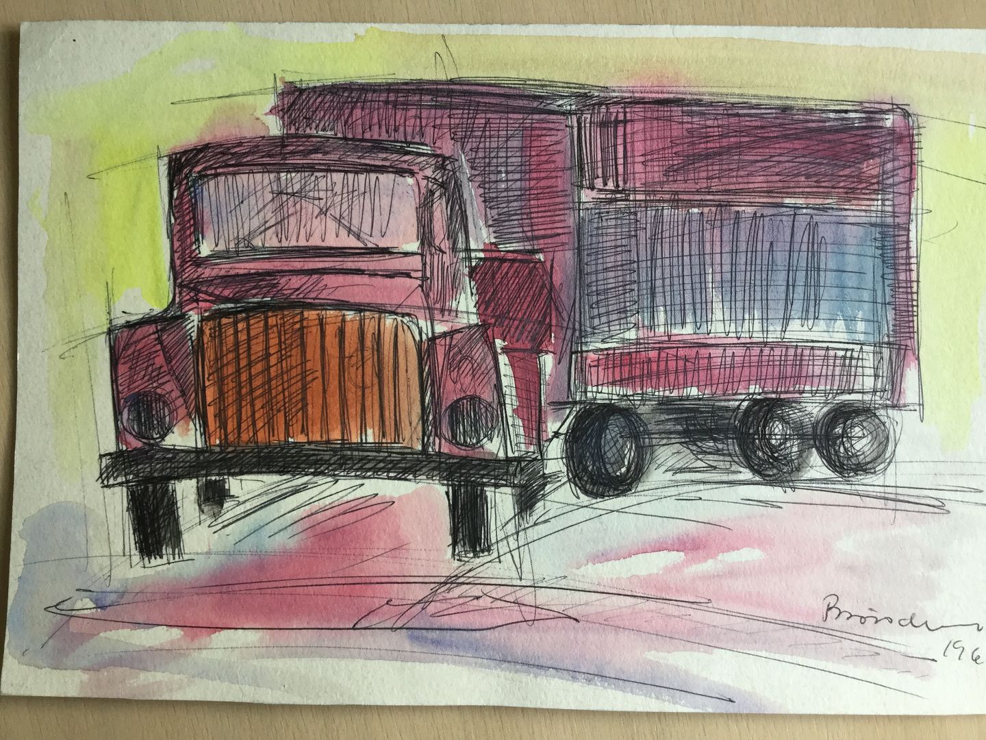 Akvarel af Peder Brøndum Sørensen - Lastbil med hænger 1964.