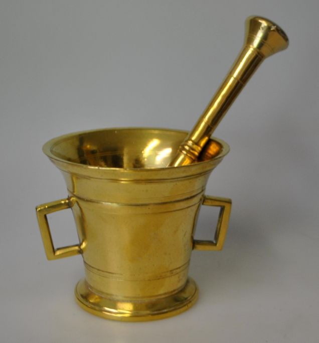 Messing morter med pistil og to hanke, 19. årh. Ustemplet. Højde.: 8,8 cm. Længde pistil: 19 cm.