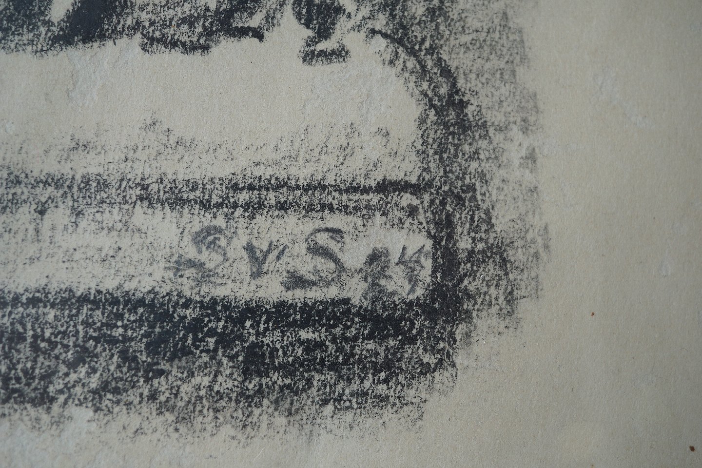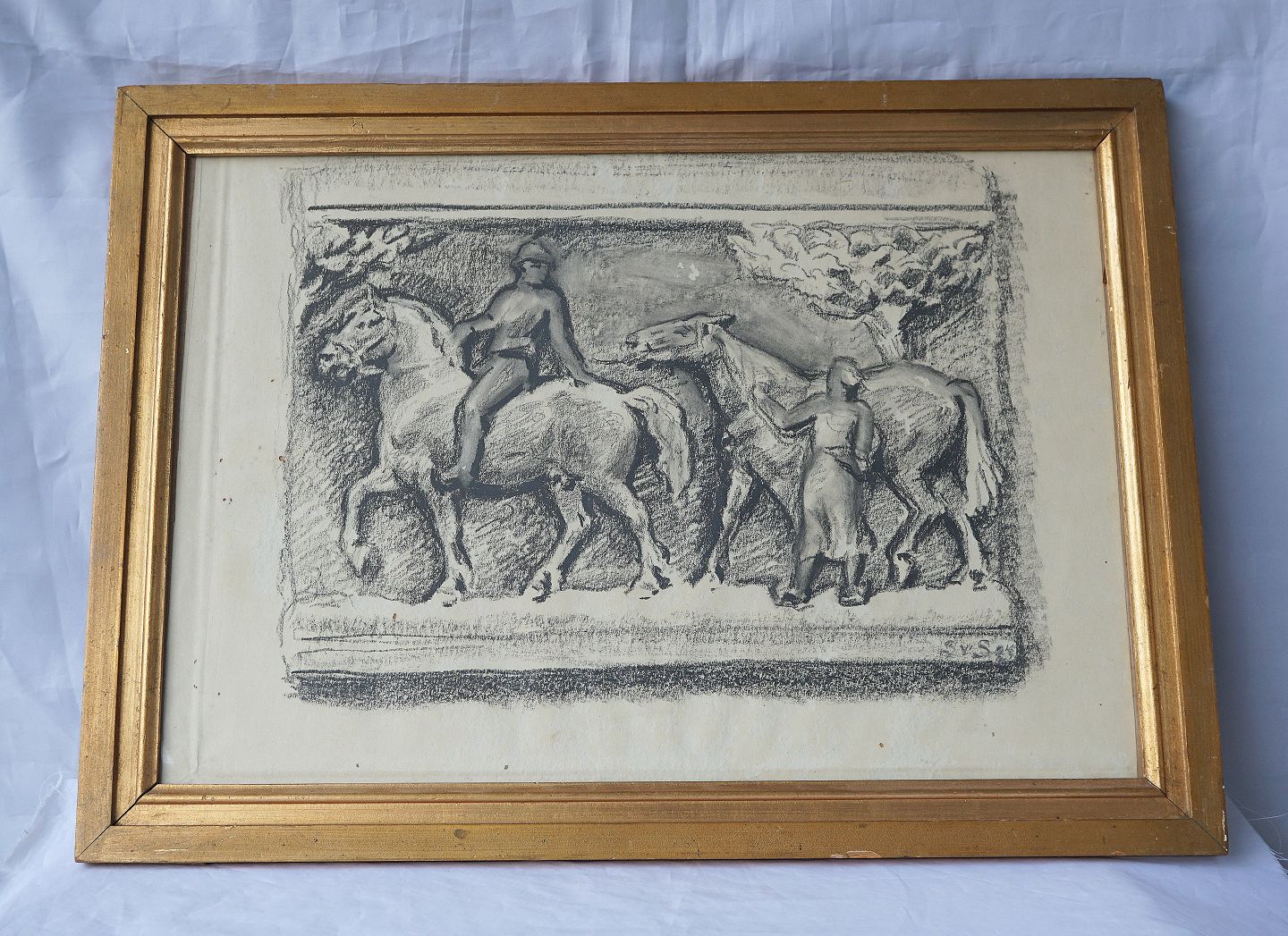 To Mænd med to heste, den ene hest trækker den anden. Kultegning af Svend Schou