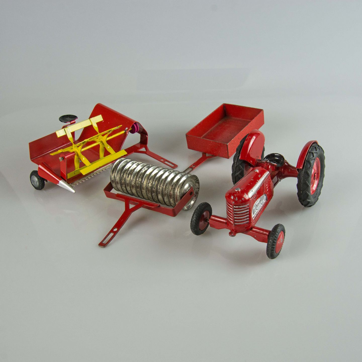 Sæt med traktor og tre forskellige landbrugsvogne i metal, fremstår samlet med minimal brugsspor