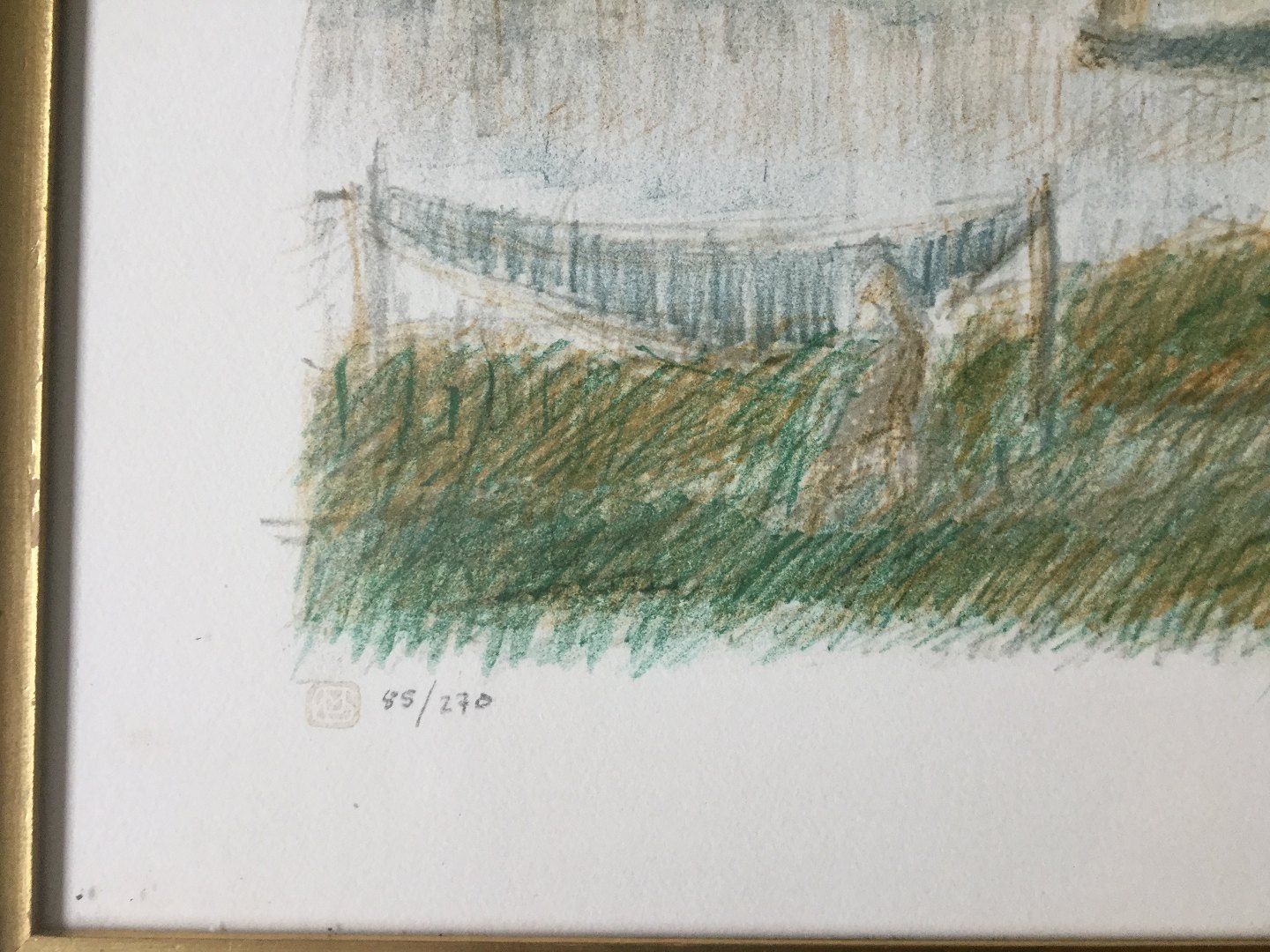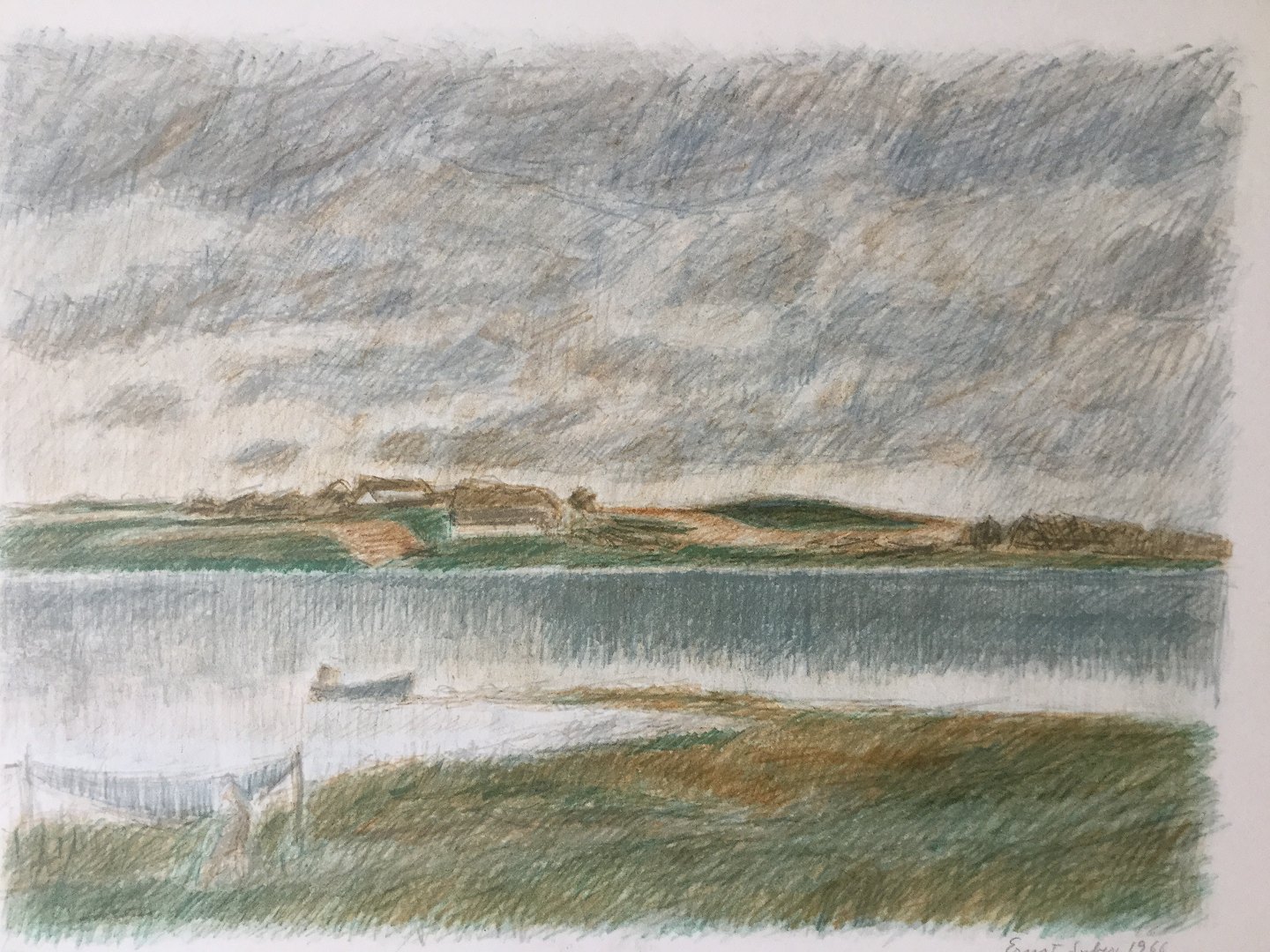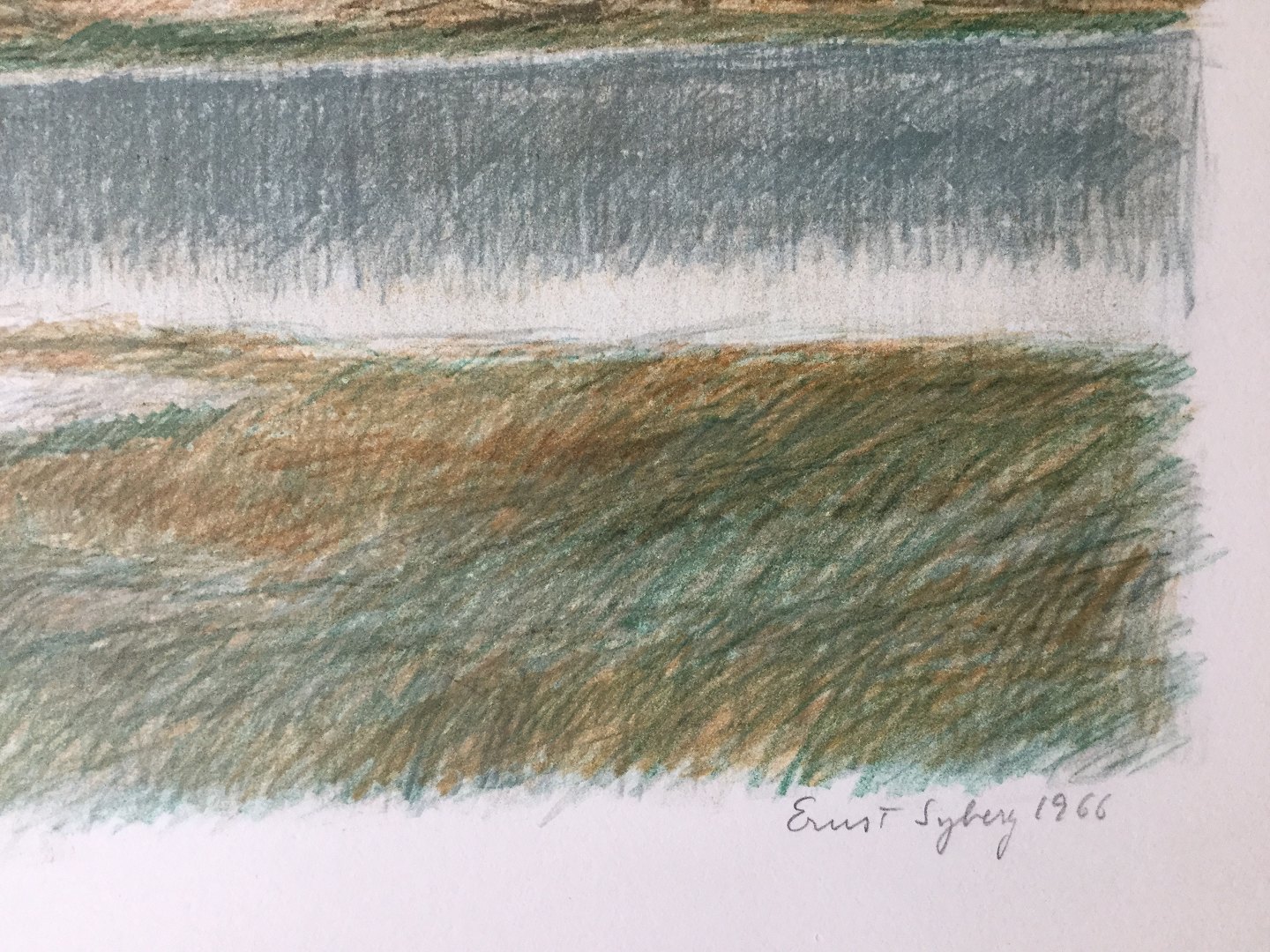 Farvelitografi af Ernst Syberg 1966 - Landskab med å løb og båd.