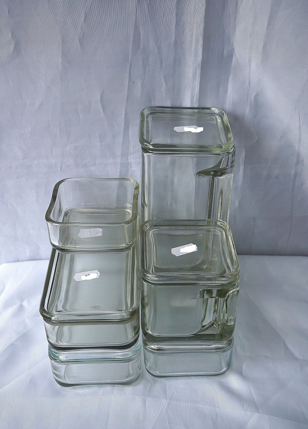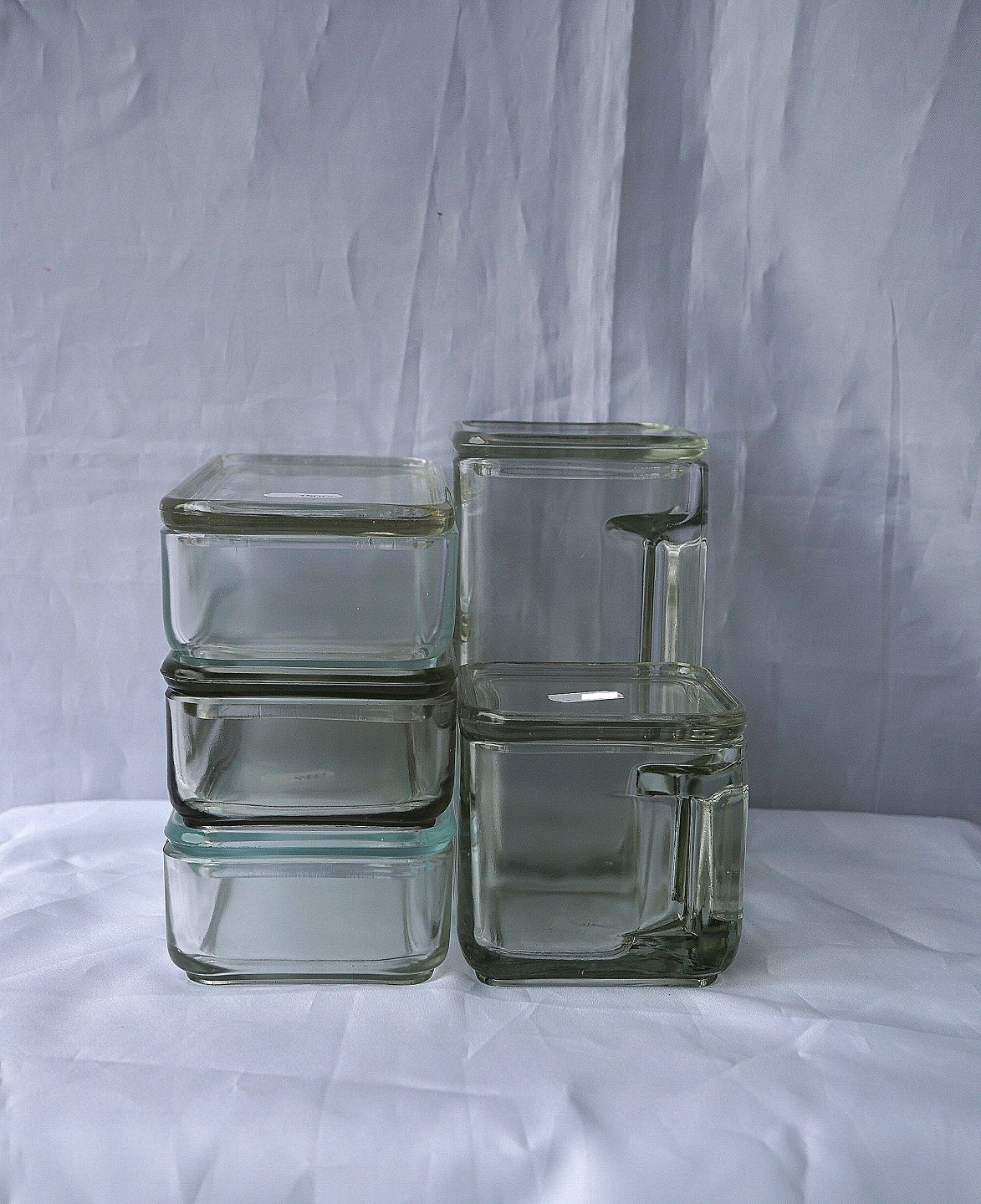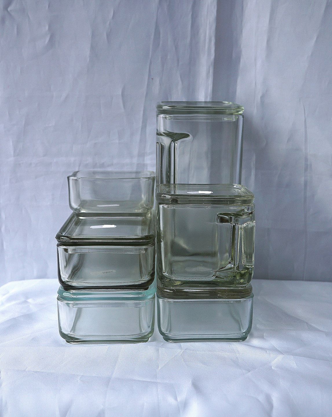 Holmegaard Glasværk, Karre System - opbevarings boxe, alle hjørne er rundet, og der er "håndtag" på mælke og flødekande.