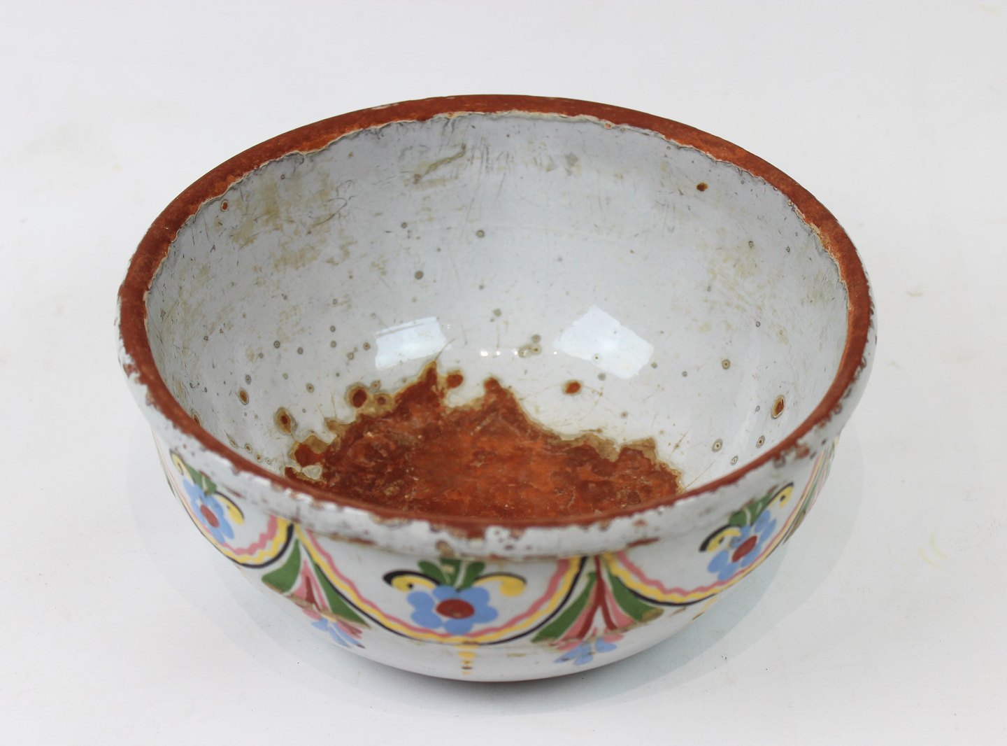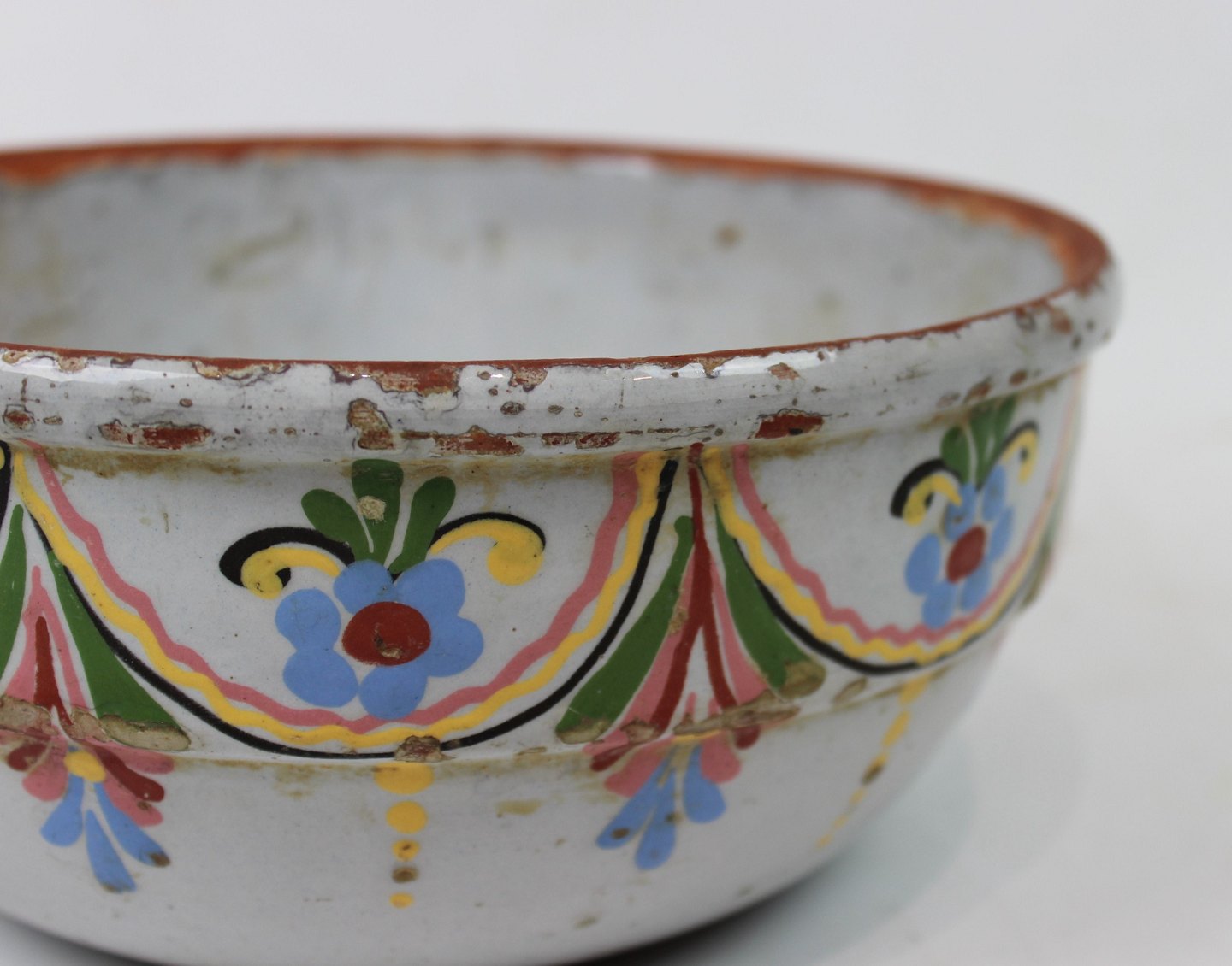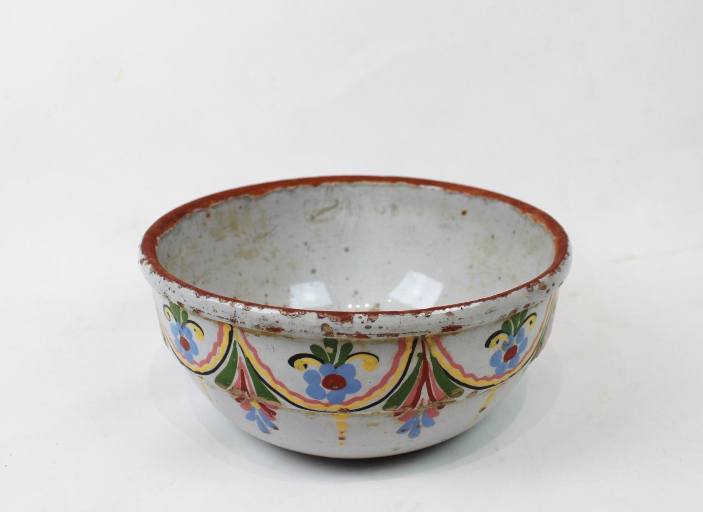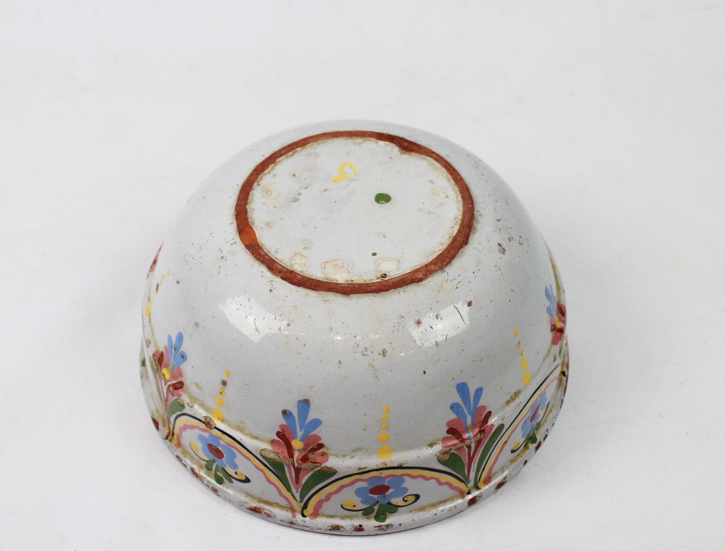 Ler skål dekoreret med lyse farver fra omkring år 1880.