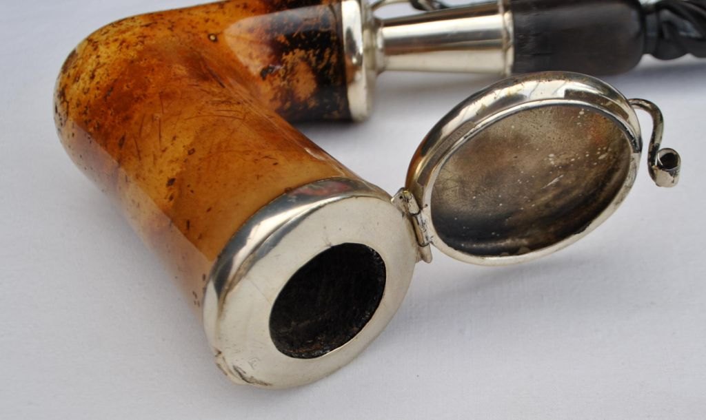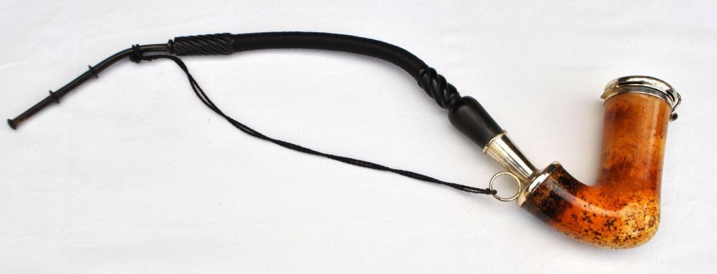 Stor lang pibe med merskum, 19. årh. Danmark. Låg af sølv med stempel. L.: 53 cm. Længde pibehoved: 13 cm.