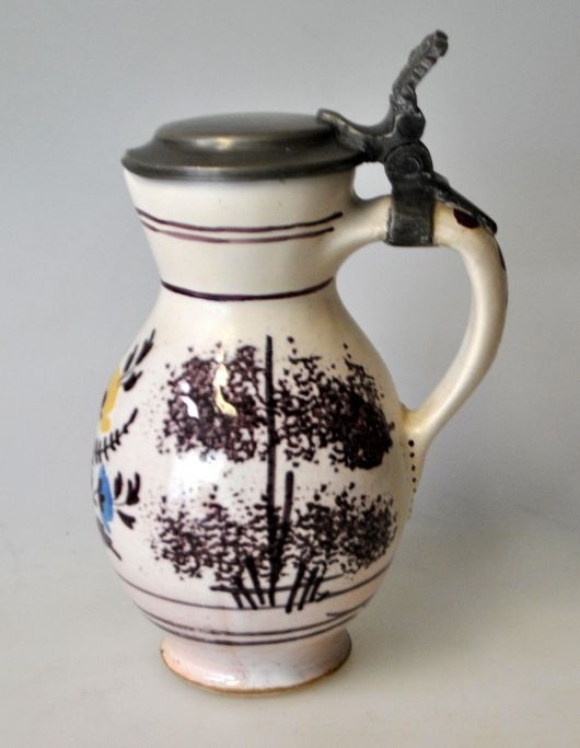 Lille fajance kande med tinlåg, 19. årh. Tyskland. Cremefarvet, polykrom dekoreret med træer og blomster. H.: 15 cm.