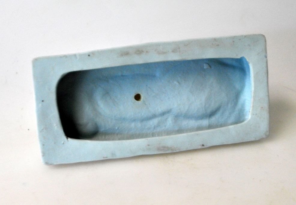 Bisquitfigur af liggende nøgen dreng, 19. årh. Tyskland. På plint af lysblå bisquit. Ustemplet.12 x 7,3 x 5,5 cm.