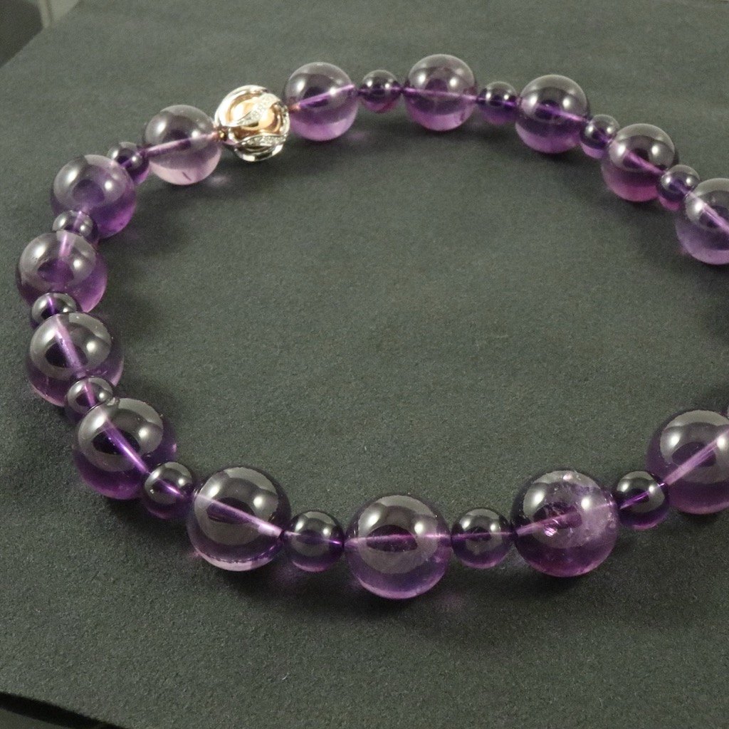 Jörg Heinz. Ametyst halskæde med kuglelås i 18k guld med diamanter 0.5 ct.