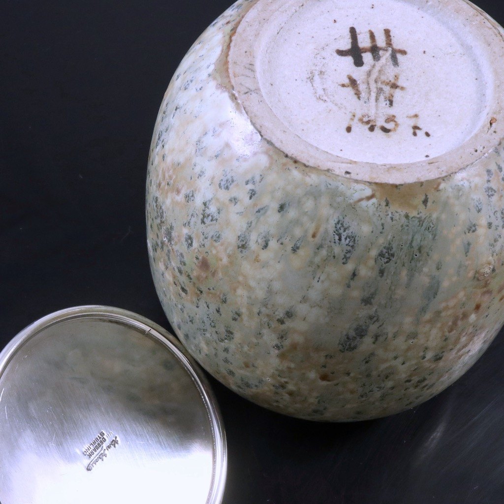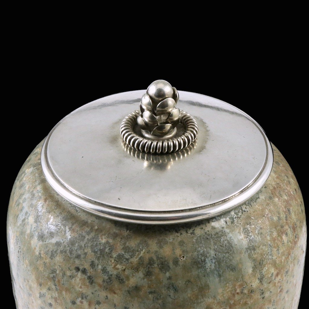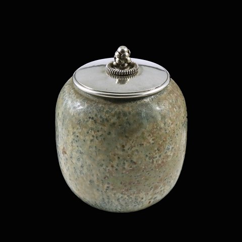 Hans Hansen. Krukke i stentøj med låg i Sterling Sølv.