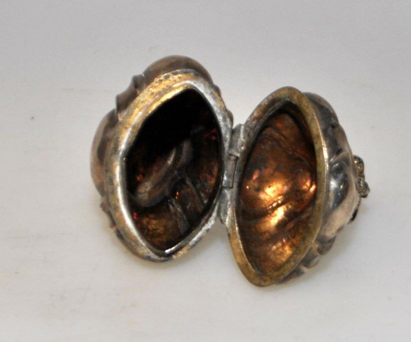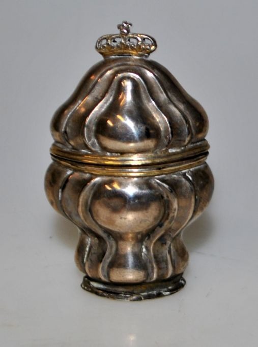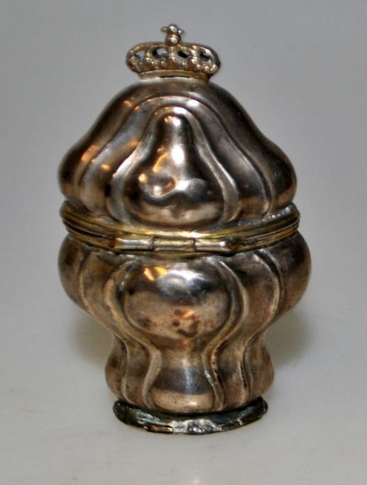 Dansk sølv hovedvandæg, skævknækket rococo, 18. årh. Topfigur i form af krone. Glat korpus. Indvendig lueforgyldt. Med indgraveringer i bunden. H.: 6,2 cm.