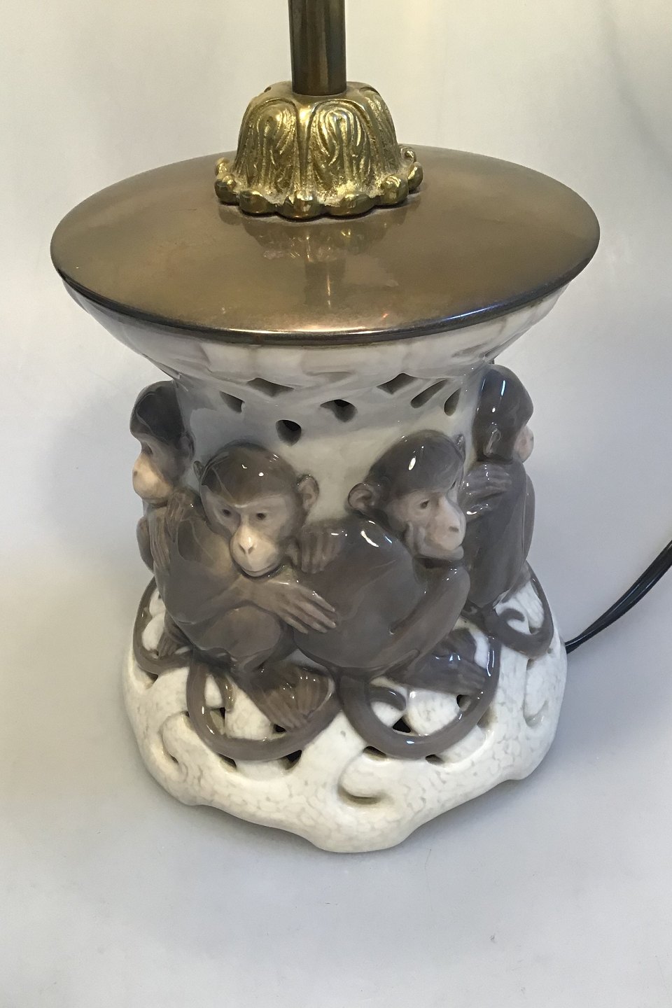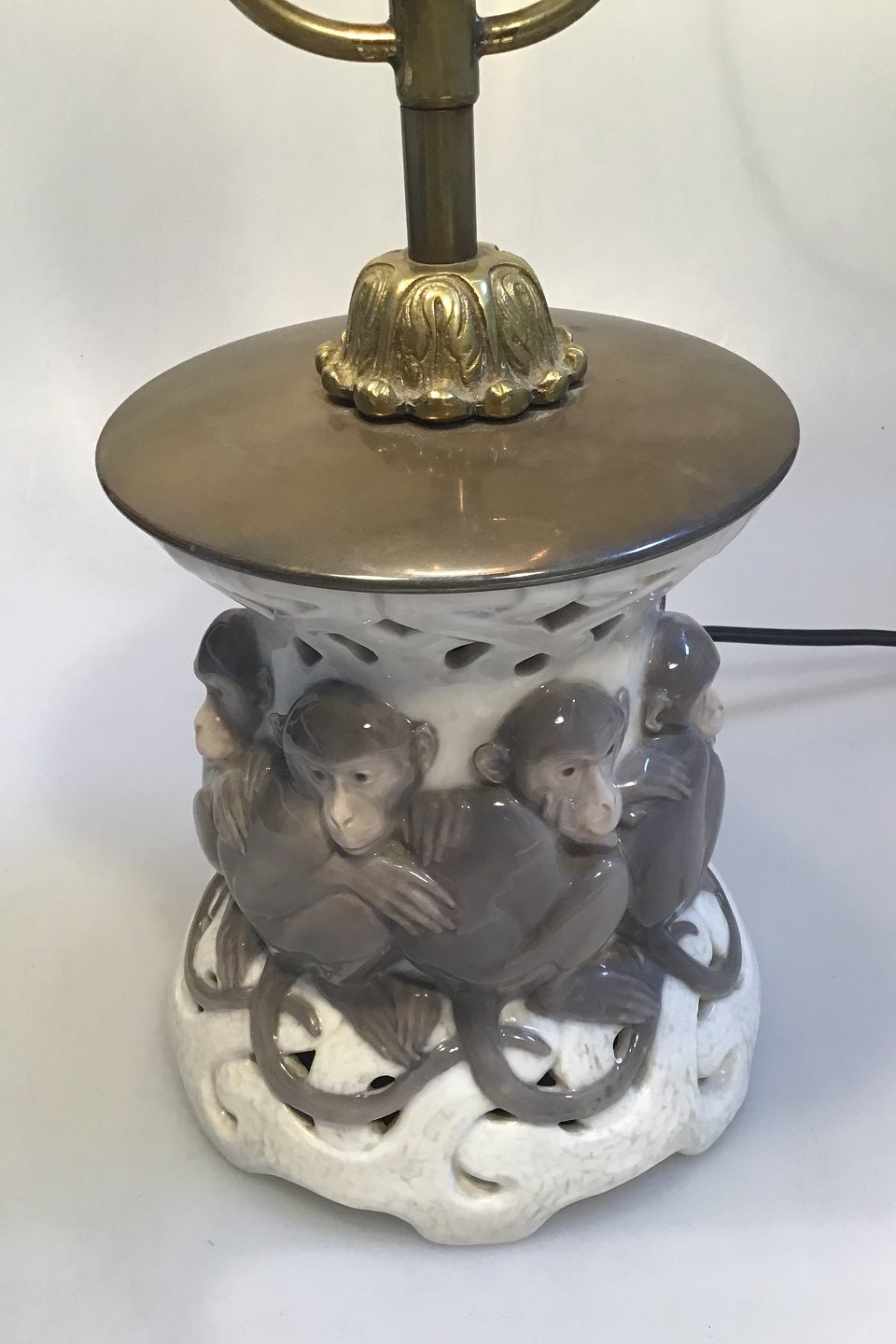 Royal Copenhagen Art Nouveau Bordlampe Abe-motiv No 796/377, Armatur af messing, textilskærm, Pre 1923 (Konverteret til el)Højde 43 cm
