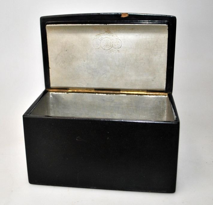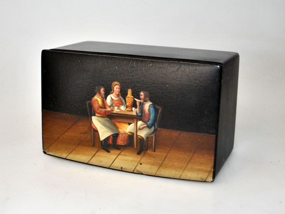 Russisk lak æske, 19. årh. Håndmalet med motiv af tre personer, der drikker the. Indvendig stemplet. 13,5 x 8 x 7,3 cm.